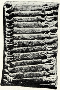 Unter den zahlreichen Briefen aus der Zeit der ersten babylonischen und der Kassiten-Dynastien, welche teils der-62- Bibliothek, teils den westlich von Chebar gelegenen Geschäftshäusern entstammen, möge wenigstens eines derselben gedacht werden (Abb. 47). Er befindet sich zur Zeit noch innerhalb seines ursprünglichen tönernen Couverts, das auf jeder der sechs Seiten zweimal mit demselben — Namen und Beruf des Absenders enthaltenden — Siegel gesiegelt und auf seiner Vorderseite „an Luschtamar‟ adressiert ist. Eine neue Katastrophe brach über Nippur herein, ehe der Brief abgeschickt werden konnte. Durch meine ermüdenden Arbeiten an der Tempelbibliothek gegenwärtig völlig in Anspruch genommen, habe ich trotz meiner begreiflichen Neugierde noch keine Zeit finden können, das Couvert zu öffnen und in die Privatkorrespondenz des Herrn Luschtamar einzudringen.