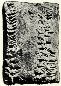 Doch wir dringen noch tiefer in die semitischen Schichten hinab und rufen endlich, nachdem wir die nahezu 2½ m dicke Plattform Ur-Gurs durchbrochen haben, mit Belsazars Vater, Nabonidos, dem Archäologen auf babylonischem Königsthrone, aus: „Was Jahrtausende lang kein König unter den Königen geschaut, — die alten Urkunden König Sargons von Akkad, sahe ich.‟ Wir stehen vor der Blütezeit babylonischer Kunst, an der Schwelle des 5. und 4. vorchristlichen Jahrtausends. Die Eleganz und Regelmässigkeit der Schriftzüge, welche die Backsteinstempel Sargons (Abb. 34), ja alle Keilschrifttafeln seiner Periode charakterisieren, finden wir in demselben Masse erst bei Aschurbânapal, etwa 3000 Jahre später, wieder. Der semitische Usurpator Sargon I. fasste zusammen, was die alten sumerischen Meister in Stein, Erz und Ton geleistet hatten, ehe es unter den Wirren einer unruhigen Zeit und den Kämpfen mit neu auftretenden Völkerstämmen nur zu bald wieder verloren ging.