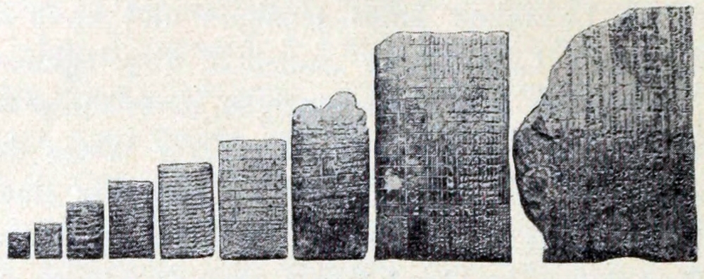 Nicht minder wertvoll sind die oft schön erhaltenen zahlreichen altbabylonischen Syllabare und Zeichenlisten mit ihren in kleiner Schrift beigefügten Lautwerten, durch welche wir unsere Kenntnis des Sumerischen bedeutend erweitern werden. Hochwichtig sind ebenfalls die Listen der verschiedenen Masse, die Synonyme ganzer Klassen von Wörtern, die geographischen Verzeichnisse, Pflanzennamen und anderes mehr. Hervorzuheben dürfte sein, dass besonders wichtige Texte auf 4-, 5-, 6- und 8-eckigen Tonprismen eingeschrieben wurden (Abb. 46). Für die Geschichte des 3. Jahrtausends sind eine Reihe chronologisch angeordneter Datenlisten von besonderem Interesse. Die Masse der religiösen, mythologischen und astrologischen Texte liegt noch im dreieckigen Hügel begraben, doch haben wir bereits an 500 sehr grosse, aber darum leider auch recht schadhafte Tafeln dieses wichtigen Literaturzweiges gesammelt. Bis jetzt sind im wesentlichen die Schulräume und die grammatisch-linguistischen und mathematisch-astronomischen Räume ausgegraben. Aus diesem Umstande allein ergibt sich mit Notwendigkeit, dass die Bibliothek nach wissenschaftlichen Prinzipien und Gegenständen geordnet war.
