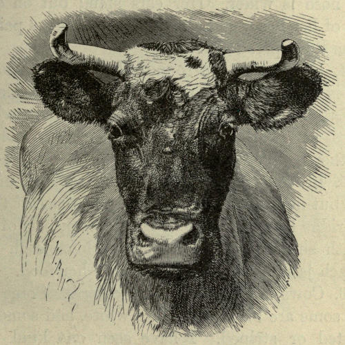 3. The cow has a heavier body and shorter legs than a horse. She has a short neck, and a long tail, with a bunch of coarse hair on the end[82] of it. Her head is larger than that of a horse, and her nose is wider. Her ears stand out on each side of her head, and above them she has a pair of horns that spread out.