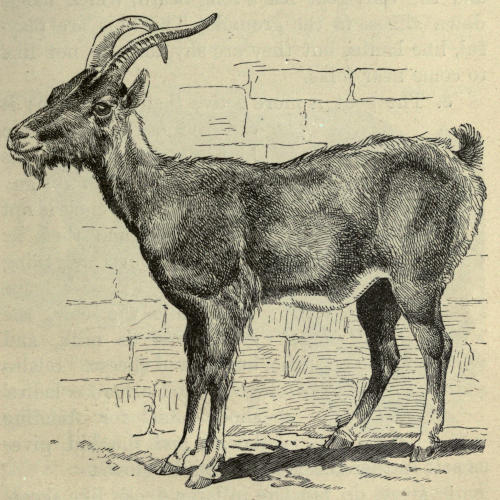 2. All the goats have spreading, sharp horns, and the billy-goat has a long beard, which hangs down almost to the ground. The kids are playful, like lambs, but they are shy, and do not like to come near folks.