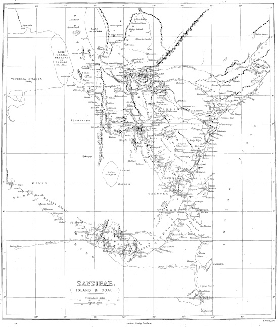 I had proposed to enrich the Appendix with extracts from Arab and other mediæval authors, who have treated of Zanzibar, Island and Coast. Such an addition, however, would destroy all proportion between the book and its subject: I have therefore confined myself to notes on commerce and tariffs of prices in 1857 to 1859, to meteorological observations, and to Capt. Smee’s coasting voyage, which dates from January, 1811. The latter will supply an excellent birds-eye view of those parts of the Zanzibar mainland which were not visited by the East African Expedition.