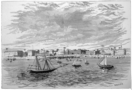 And now we could distinguish the normal straight line of Arab town, extending about a mile and a half in length, facing north, and standing out in bold relief, from the varied tints and the grandeur of forest that lay behind. A Puritanical plainness characterized the scene—cathedrals without the graceful minarets of Jeddah, mosques without the cloisters of Cairo, turrets without the domes and monuments of Syria; and the straight stiff sky-line was unrelieved except by a few straggling palms. In 33the centre, and commanding the anchorage, was a square-curtained artless fort, conspicuous withal, and fronted by a still more contemptible battery. To its right and left the Imam’s palace, the various Consulates, and the large parallelogrammic buildings of the great, a tabular line of flat roofs, glaring and dazzling like freshly white-washed sepulchres, detached themselves from the mass, and did their best to conceal the dingy matted hovels of the inner town. Zanzibar city, to become either picturesque or pleasing, must be viewed, like Stambul, from afar.