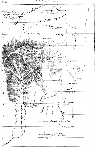 I consulted my excellent friend the late Dr Barth, of Timbuktu, about following the footsteps of pilot Diogenes the Fortunate. He replied in a kind and encouraging letter, hinting, however, that no prudent man would pledge himself to discover the Nile sources. The Royal Geographical Society benevolently listened once more to my desire of penetrating into the heart of the Dark Continent. An Expeditionary Committee was formed by Sir Roderick I. Murchison, the late Rear-admiral Beechey (then President of the Society), Colonel Sykes, Chairman of the Court of Directors of the Hon. East Indian Company, Mr Monckton Milnes (Lord Houghton), Mr Francis Galton, the South African traveller, and Mr John Arrowsmith. I did not hear, strange to say, till many years had passed, 8of the active part which Vice-admiral Sir George Back, the veteran explorer of the Arctic regions, had taken in urging the expedition, and in proposing me as its head. Had it been otherwise, this recognition of his kindness would not have come so tardily.