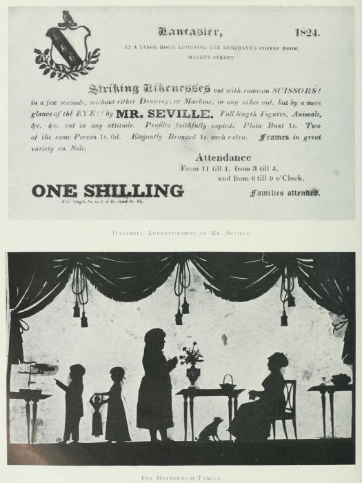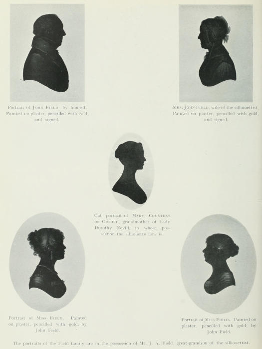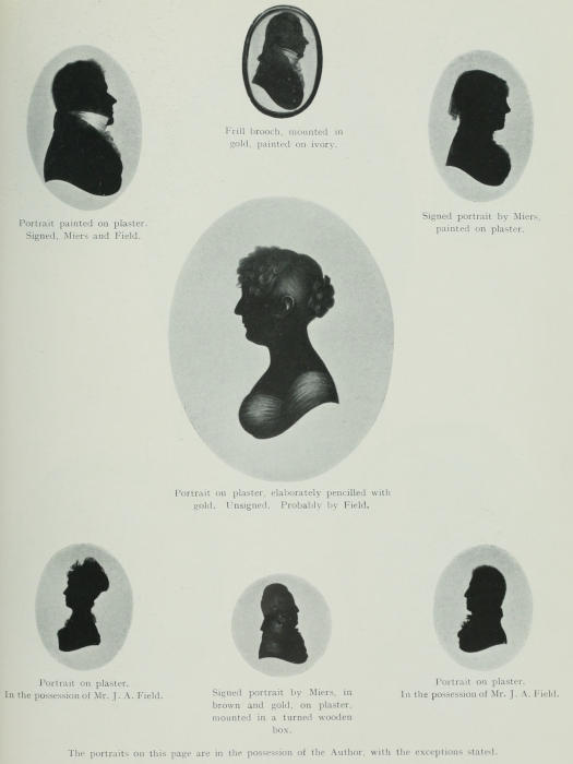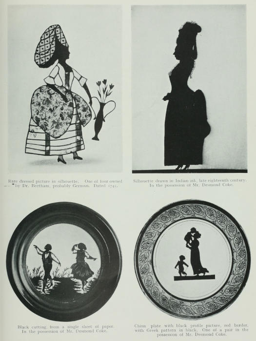 My sincere thanks are due to Mrs. Head, Mrs. Whitmore, Madame Nossof, Mrs. Wadmore, Mrs. Lea Carson (of Philadelphia), Mrs. Whetridge, Mr. Francis Wellesley, Mr. H. Palmer, Mr. Desmond Coke, Mr. Holworthy, Captain Pringle, Mr. H. Terrell (of Boston), Mr. Laurence Park, Dr. Beetham (descendant of Mrs. Beetham, the fine eighteenth-century silhouettist), Mr. J. A. Field, for the interesting series of portraits painted by his great-grandfather, and many others, who, possessing silhouettes, have allowed me to visit and make a study of their collections or have sent specimens for examination. Without their courtesy, and that of many others who gave me facilities for studying some thousands of specimens and advertisements, it would have been impossible to write this book. A subject on which there exists no written history, and which has hitherto received scant attention, requires much research amongst a large number of examples, amongst old newspaper matter, contemporary social history, and the trade labels of the silhouettists, for its faithful record.