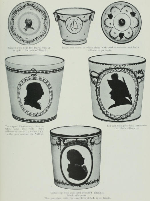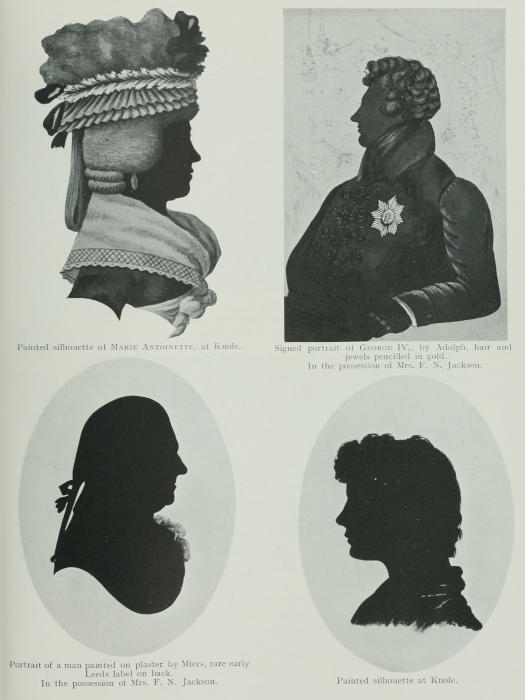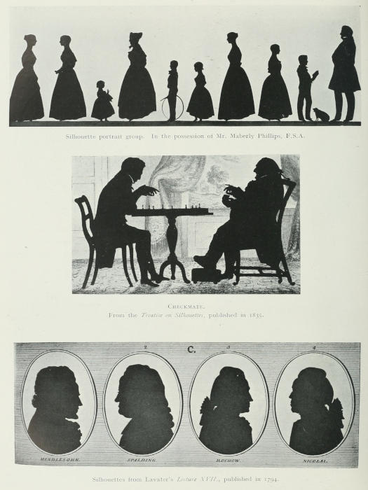 More especially I am grateful to those who have kindly permitted me to reproduce their silhouettes, thus making clear to art lovers, and those who take pleasure in the curio, how manifold are the charms of family treasure, which would not otherwise have been available for study. To Herr Julius[2] Leisching, Director Erzerzog Rainer Museum, I am indebted for information concerning silhouettists of Germany and Austria contained in his memorandums of the Industrial Museum; to Sir Sidney Colvin, Keeper of the Prints in the British Museum; to Mr. C. J. Holmes, Director of the National Portrait Gallery; to Mr. T. Corsan Morton, of the National Galleries of Scotland; to Mr. D. E. Roberts, of the Library of Congress, Washington, for access to special collections; to Mr. Horace Cox and Mr. T. P. O’Connor, with regard to pictures under their control in the “Collector” and the Magazine; to Lady Dorothy Nevill, for placing at my disposal the beautiful silhouette work of Princess Elizabeth, daughter of George III.; to Lady Sackville, for allowing me to study the silhouettes of Knole, and to reproduce some of the silhouette porcelain in her possession.