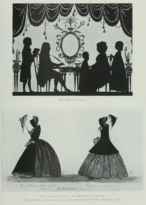 Fanny Burney delights in the black portraits; all the Burney family are grouped together. She records her visits to the silhouettist Charles, when her attendance on the Queen as Maid of Honour was over. This portrait shows the famous creator of “Evelina” to be sprightly indeed; her delicate profile is well set off with curled and powdered hair, lace ruffle, and beribboned hat, whose tilt must surely have been learnt at Versailles.