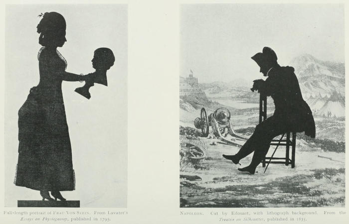 Into the lives of great personages, such as Goëthe, Napoleon, our English kings, queens, and princesses, the silhouette creeps with colourless persistence; there is no escaping it. Goëthe writes letters to his mother, and to Lavater, being touched with enthusiasm for the silhouette and its uses by the zealous Zürich minister. The poet cut a few himself. Napoleon presents glass profile portraits of himself in black on gold tinsel ground to[7] his generals. Princess Elizabeth, daughter of George III., is a famous scissor-woman, and many are the pictures she cut, not only of her father, mother, and sisters, but also of trees, birds and flowers, rural scenes, cupids, and cupid groups.