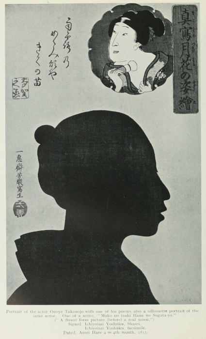 There is a simplicity in the silhouette picture which brings it nearer to the Japanese print in its effect upon the mind than any other expression in art. All our attention is concentrated on outline, and in consequence there is a directness and vigour in the likeness which are lacking in more complex studies. Some Japanese artists, recognising this peculiar quality in the black profile portrait, supplement a conventionally drawn coloured portrait with a silhouette.