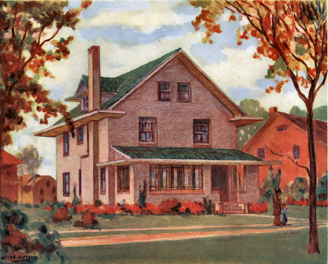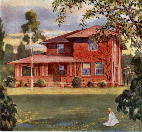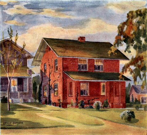 The American manufacturer of face brick has far outstripped the rest of the world in the wide range of color tones and textures he offers. So that the prospective builder has before him the possibility of giving to the exterior wall surface an enduring color scheme of monochrome uniformity or polychrome blending, as his taste may dictate. The whole sweep of color, in smooth or rough textures, is at his command from the pure, severe tones of pearl grays or creams, through buff, golden, and bronze tints to a descending scale of reds, down to purples, maroons, and even gun metal blacks. Thus, instead of building for your client a house of a dull, insubstantial, unattractive appearance, you can, by the use of face brick, build a substantial, enduring house that presents to the eye a veritable symphony in color, at once a satisfaction to yourself as well as to him, and a cause of appreciative remark by his neighbors or the casual passersby. It will always stand to the credit of your art as a builder.