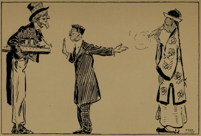 During this so happy annual that is past many National Events has happened to me. Brick-bat wound sent by labouring union has swole up, thank you, enjoying some agony; Miss Furioki which married cousin Nogi loves me so little; C. W.[364] Kurashuke, Japanese dentistry, operate on my toothache which I shall never pay for; Arthur Kickahajama, missionary boy, ruin the beauty of my derby hat by wearing it; I must suicide myself to hari-kiri on account of O-Fido who create expense & only wag about it; I have acquired a feetwet by searching for employment which brings me the result of great influenza and sneezing in hon. nose. All these blessings make Japanese Boy forgiving to turn over new leap-year.