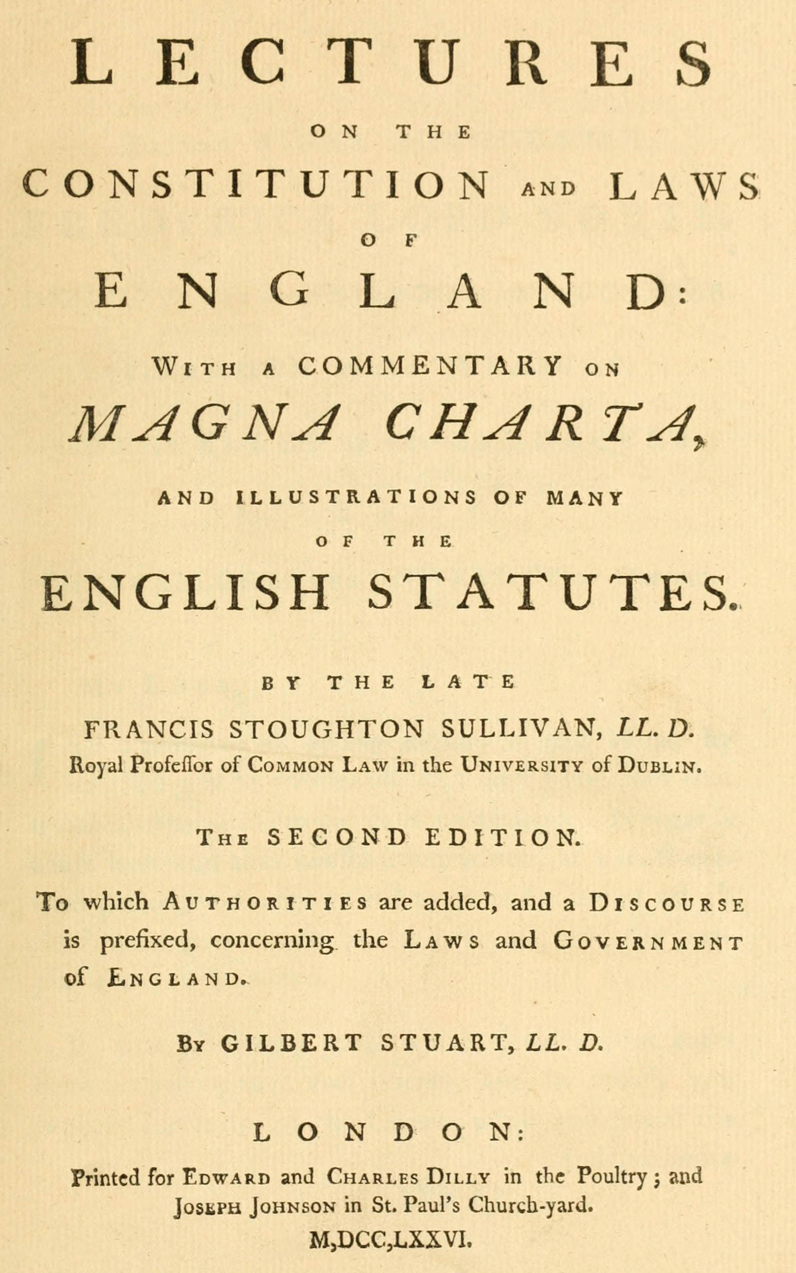 The Authorities assigned for Dr. Sullivan’s Opinions and Reasonings are furnished by the Editor. They are not, perhaps, in every Instance those to which he himself would have appealed. This could not have been expelled. They are such, notwithstanding, as will assist the Student; and the Preliminary Discourse, it is hoped, will not be thought an useless or improper Addition to his Lectures. It will be a Pleasure to the Editor to reflect that he has endeavoured to pay a Tribute of Respect to the Writings of a virtuous Man and an ingenious Lawyer, whom an immature Death had ravished from his Friends and from Society.