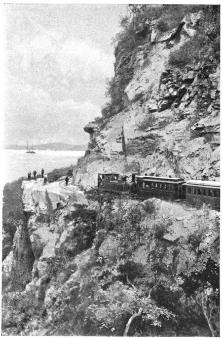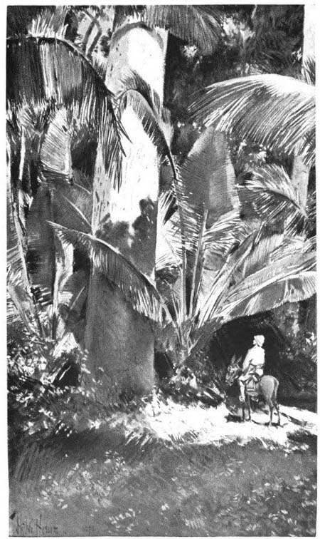 [241]It is a very remarkable railroad; its tracks cling to the perpendicular surface of the mountain like the tiny tendrils of a vine on a stone-wall, and the trains creep and crawl along the edge of its precipices, or twist themselves into the shape of a horseshoe magnet, so that the engineer on the locomotive can look directly across a bottomless chasm into the windows of the last car. The view from this train, while it pants and puffs on its way to the capital, is the most beautiful combination of sea and plain and mountain that I have ever seen. There are higher mountains and more beautiful, perhaps, but they run into a brown prairie or into a green plain; and there are as beautiful views of the ocean, only you have to see them from the level of the ocean itself, or from a chalk-cliff with the downs behind you and the white sand at your feet. But nowhere else in the world have I seen such magnificent and noble mountains running into so beautiful and green a plain, and beyond that the great blue stretches of the sea. When you look down from[242] the car-platform you see first, stretching three thousand feet below you, the great green ribs of the mountain and its valleys and waterways leading into a plain covered with thousands and thousands of royal palms, set so far apart that you can distinguish every broad leaf and the full length of the white trunk. Among these are the red-roofed and yellow villages, and beyond them again the white line of breakers disappearing and reappearing against the blue as though some one were wiping out a chalk-line and drawing it in again, and then the great ocean weltering in the heat and stretching as far as the eye can see, and touching a sky so like it in color that the two are joined in a curtain of blue on which the ships seem to lie flat, like painted pictures on a wall.