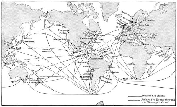 MAP OF THE WORLD SHOWING CHANGES IN TRADE ROUTES AFTER THE COMPLETION OF THE NICARAGUA CANAL 191