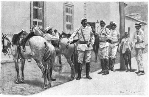 The ladies of Caracas seem to spend much of[249] their time sitting at these windows, and are always there in the late afternoons, when they dress themselves and arrange their hair for the evening, and put a little powder on their faces, and take their places in the cushioned window-seats as though they were in their box at the opera. And though they are within a few inches of the passers-by on the pavement, they can look through them and past them, and are as oblivious of their presence as though they were invisible. In the streets are strings of mules carrying bags of coffee or buried beneath bales of fodder, and jostled by open fiacres, with magnificent coachmen on the box-seat in top-boots and gold trimmings to their hats and coats, and many soldiers, on foot and mounted, hurrying along at a quick step in companies, or strolling leisurely alone. They wear blue uniforms with scarlet trousers and facings, and the president’s body-guard are in white duck and high black boots, and are mounted on magnificent horses.