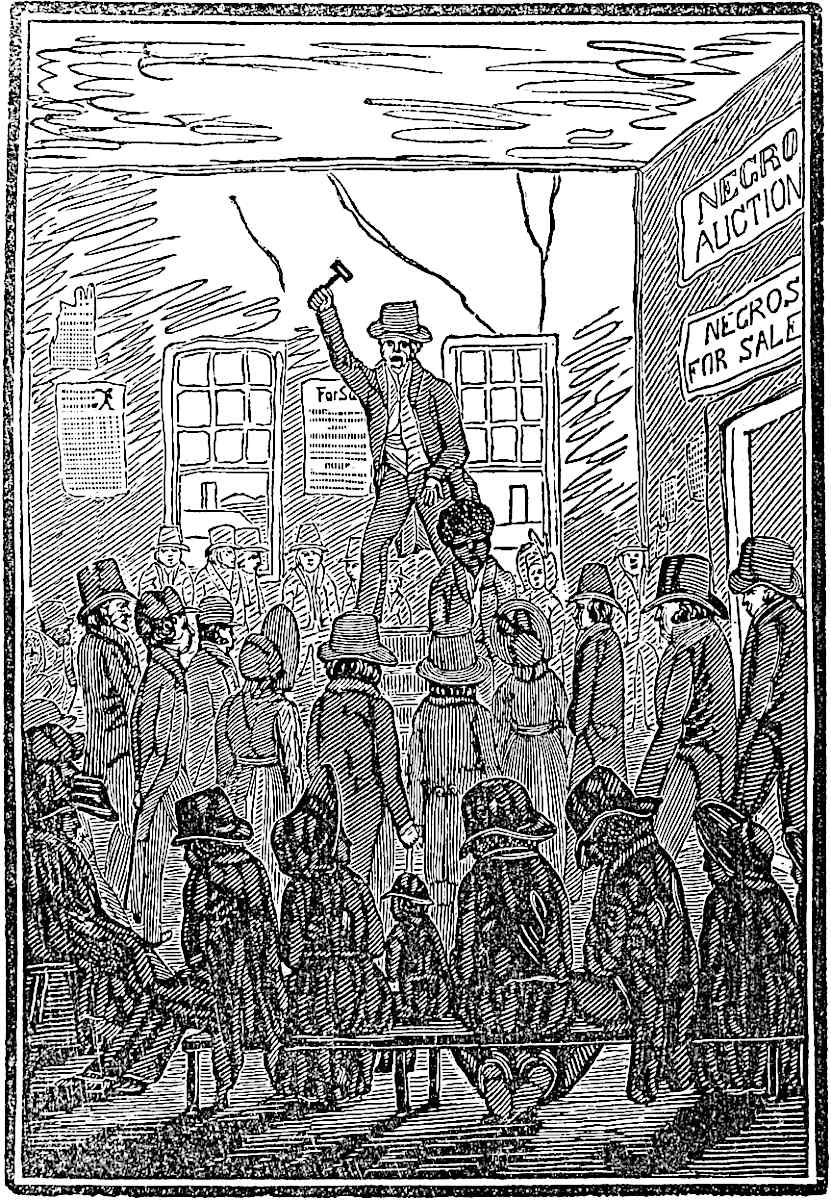 I had recovered from my sickness but a few months, when one day, looking up the road, I saw a man riding towards the house; I ran with the rest of the children to hide ourselves until the man had gone. When I had remained concealed some time, I ventured out again, and found Mr. Bibb, my master, looking for me, who ordered me into the house; and when I got there, to my astonishment, I found the man whom we had hid ourselves from, sitting in the room. After he had inspected me to his satisfaction, I was ordered out of the room, and went to play, and had forgotten the whole affair, when my master called me again, and ordered me to hold the stranger's horse. I did so, and in a few minutes he came forth and ordered me to mount behind him. This, with his assistance, I did; but rode only a short distance, when I jumped from the horse and ran for the house as fast as I could. He succeeded, however, in overtaking me, and I was again put on the horse, this time in front of him; and in this way was I carried to Fredericksburg. I was then placed in the possession of Mr. Janer, better known as Parson Janer; the man that had bought me being the son of Mr. Janer, who was one of those jolly, good-natured clergymen, who, while he feasted his numerous guests in the parlor, starved his slaves in the kitchen. After remaining there awhile, it was determined to send me to Richmond. The same man that brought me, came for me and ordered me to take a seat on the stage-coach, and the next day I found myself in Richmond, and stopped at the Eagle Hotel, kept by Mr. Holman, where I remained two or three days, and then was carried to the auction room; entering which, I found several slaves, seated around the room waiting for the8 hour of sale. Some were in tears; others were apparently cheerful. This brought to my mind my mother, and caused me to shed many tears; but they fell unheeded. The auctioneer was busy examining the slaves before the sale commenced. At last everything was ready, and the traffic in human flesh began. I will attempt9 to give as accurate an account of the language and ceremony of a slave auction as I possibly can. "Gentlemen, here is a likely boy; how much? He is sold for no fault; the owner wants money. His age is forty. Three hundred dollars is all that I am offered for him. Please to examine him; he is warranted sound. Boy, pull off your shirt—roll up your pants—for we want to see if you have been whipped." If they discover any scars, they will not buy; saying that the nigger is a bad one. The auctioneer seeing this, cries, "Three hundred dollars, gentlemen, three hundred dollars. Shall I sell him for three hundred dollars? I have just been informed by his master, that he is an honest boy, and belongs to the same church that he does." This turns the tide frequently, and the bids go up fast; and he is knocked off for a good sum. After the men and women are sold, the children are put on the stand. I was the first put up. On my appearance, several voices cried, "How old is that little nigger?" On hearing this expression, I again burst into tears, and wept so that I have no distinct recollection of his answer. I was at length knocked down to a man whose name was Denton, a slave trader, then purchasing slaves for the Southern market. His first name I have forgotten. Each one of the traders has private jails, which are for the purpose of keeping slaves in; and they are generally kept by some confidential slave. Denton had one of these jails, to which I was conducted by his trusty slave; and on entering I found a great many slaves there, waiting to be sent off as soon as their numbers increased. These jails are enclosed by a wall about 16 feet high, and the yard-room is for the slaves to exercise in; and consists of but one room, in10 which all sexes and ages are huddled together in a mass. I stayed in this jail but two days, when the number was completed, and we were called out to form a line. Horses and wagons were in readiness to carry our provisions and tents, so that we might camp out at night. Before we had proceeded far, Mr. Denton gave orders for us to stop, for the purpose of handcuffing some of the men, which, he said in a loud voice, "had the devil in them." The men belonging to this drove were all married men, and all leaving their wives and children behind; he, judging from their tears that they were unwilling to go, had them made secure. We started again on our journey, Mr. Denton taking the lead in his sulky; and the driver, Mr. Thornton, brought up the rear. I will not weary my readers with the particulars of our march to Tennessee, where we stopped several days for the purpose of arranging our clothes. While stopping, the men were hired out to pick cotton. While in Tennessee, we lost four of our number, who died from exposure on the road. After the lapse of three weeks, we started again on our journey, and in about four weeks arrived in Natchez, Miss., and went to our pen, which Mr. Denton had previously hired for us, and had our irons taken off and our clothes changed; for Mr. Denton was expecting visitors to examine the flock, as he would sometimes term us. There was a sign-board in front of the house, which informed traders that he had on hand, blacksmiths, carpenters, field-hands; also several sickly ones, whom he would sell very cheap. In a short time purchasers became plenty, and our number diminished. I was not sold for several weeks, though I wished to be the first, not wishing to witness his cruelty to his slaves any longer; for12 if they displeased him in the least, he would order them to be stripped, and tied hand and foot together. He would then have his paddle brought, which was a board about two feet in length and one inch in thickness, having fourteen holes bored through it, about an inch in circumference. This instrument of torture he would apply, until the slave was exhausted, on parts which the purchaser would not be likely to examine. This mode of punishment i