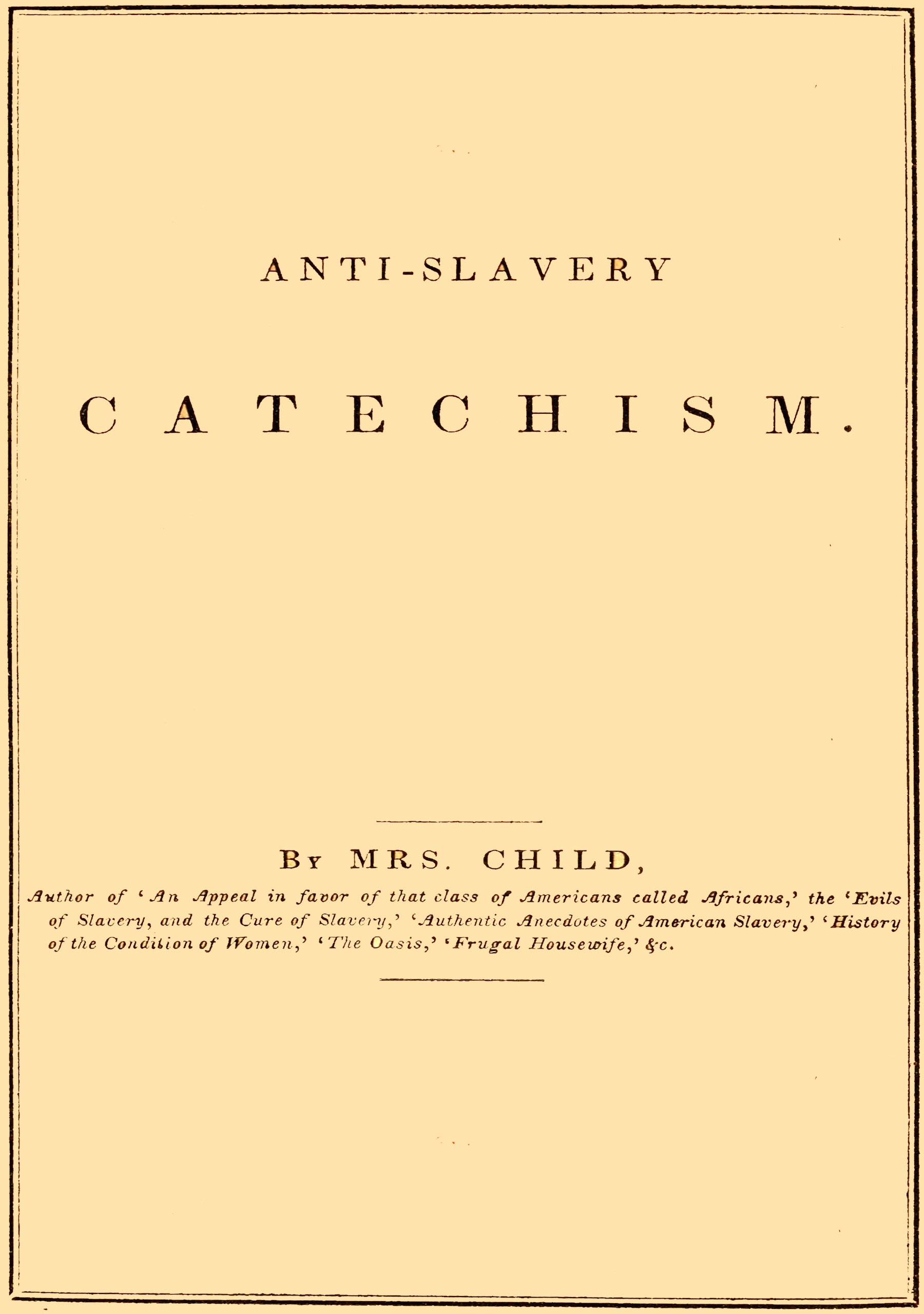 Author of ‘An Appeal in favor of that class of Americans called Africans,’ the ‘Evils of Slavery, and the Cure of Slavery,’ ‘Authentic Anecdotes of American Slavery,’ ‘History of the Condition of Women,’ ‘The Oasis,’ ‘Frugal Housewife,’ &c.