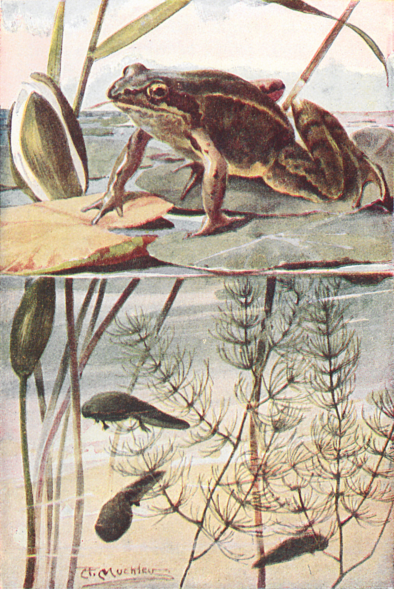 Nach einer Woche ungefähr schlängelt sie sich aus der Gallertmasse heraus und hängt sich mit dem Maule an eine Wasserpflanze (1). Dann wachsen ihr zwei sonderbare Büschel an beiden Seiten des Kopfes. Sie entnimmt damit dem Wasser die Luft zum Atmen. Man kann sie deutlich sehen, wenn man ein Glas in den Teich taucht und einige Kaulquappen fängt.