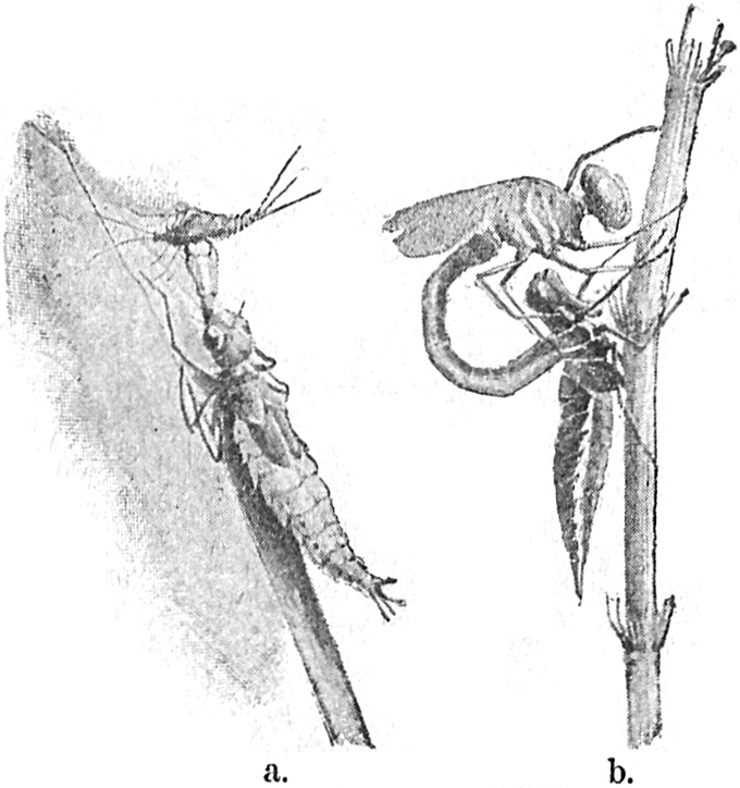 Wenn man im April öfter zu einem Teich geht, wo sich Libellen finden, kann man vielleicht beobachten,[S. 13] wie sie ihr Leben in der Luft beginnt. Dies geschieht folgendermaßen.