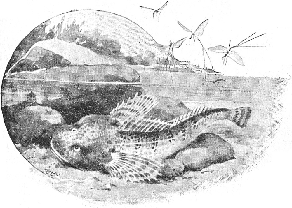 Sieh jene Fische von ungefähr 7–8 cm Länge, die unter der Brücke hin- und herschwimmen. Sie heißen Kaulköpfe, weil sie einen breiten, dicken Kopf haben. Sie haben an jeder Seite des Kopfes einen spitzen Wangenstachel, den man fühlen kann, wenn man den Fisch in die Hand nimmt. Der[S. 36] Eisvogel weiß das ganz gut; er verschlingt keinen Kaulkopf, denn sie würden ihm im Halse stecken bleiben.