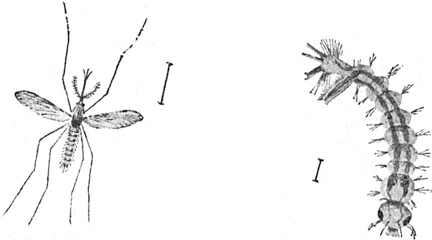 Diese Mücken sind erst vor einigen Wochen ans Licht der Welt gekommen. Die weibliche Mücke legt einige klebrige Eier, nicht größer als die Spitze einer Stecknadel, auf die Oberfläche des Wassers. Bald kriechen aus den Eiern Larven aus, die wie winzige Würmchen aussehen und feine Härchen an den Seiten haben. Sie schwimmen im Wasser umher und nähren sich von kleinen Stückchen der Wasserpflanzen.