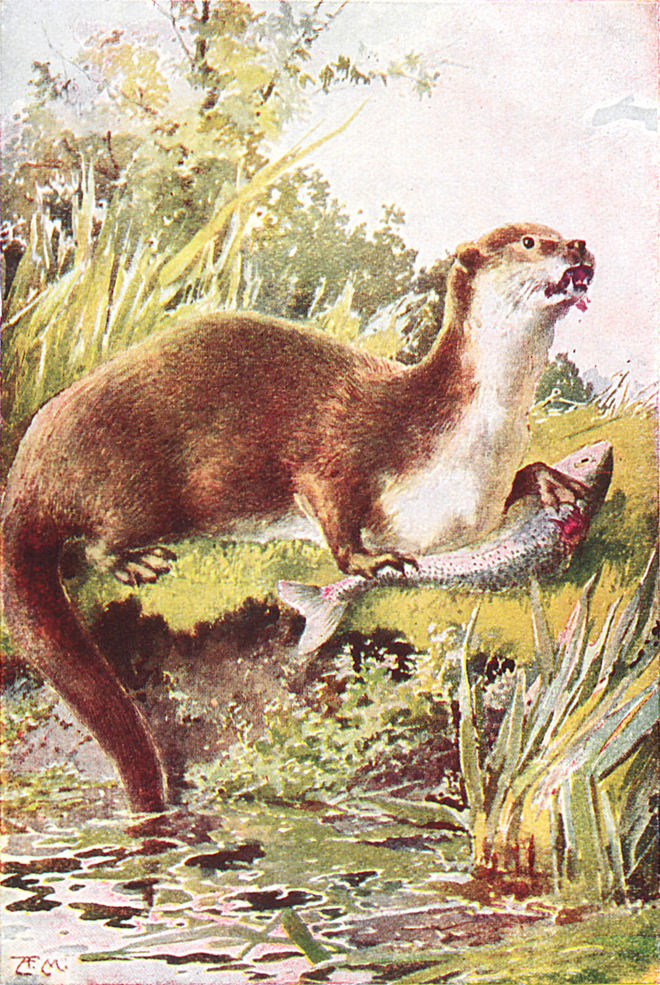 Der alte männliche Otter biß wütend auf seinen[S. 41] Fisch ein und warf zuweilen den Jungen kleine Stücke hin, die bald mit ihrem kleinen Fisch fertig waren. Zuletzt war alles aufgefressen außer den Köpfen und Schwänzen. Dann glitt der alte Otter vom Ufer hinab ins Wasser, die anderen folgten ihm, und sie begannen wieder zu fischen.