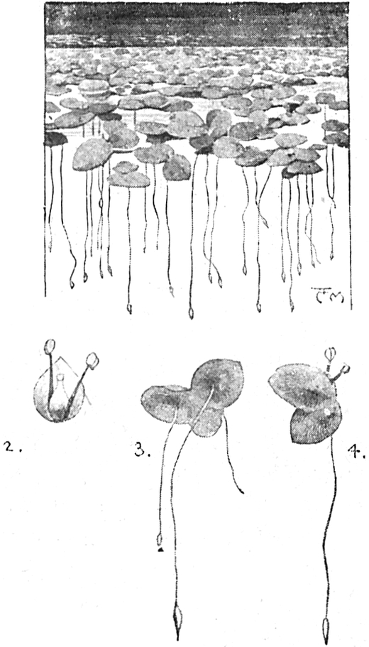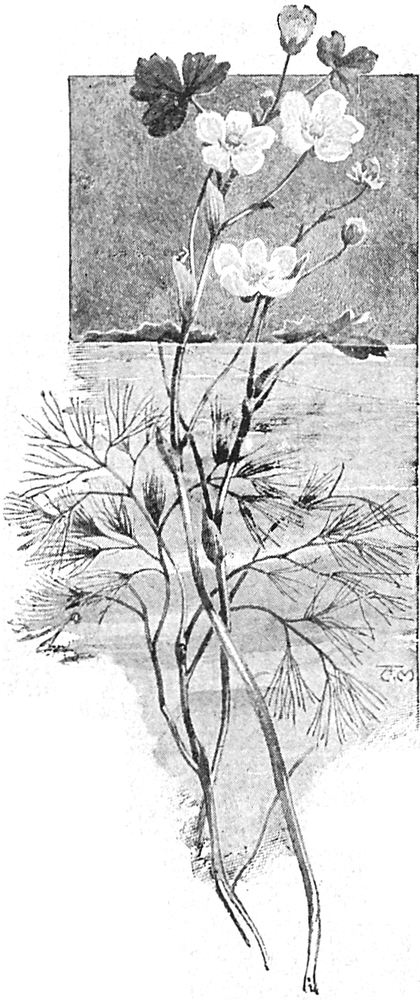 „Dann muß ich einige von jenen weißen Sternen mit dem gelben Punkt in der Mitte haben. Sie sehen so hübsch aus zwischen den feinen grünen Blättern, die in drei Lappen geteilt sind. Das ist der Wasserhahnenfuß, und wenn du etwas davon mit deinem Stock heranholst, so werden wir sehen, daß die Pflanze noch andere Blätter unter dem Wasser hat, die in feine Streifen gespalten sind[S. 43] wie schmale Grashalme.“