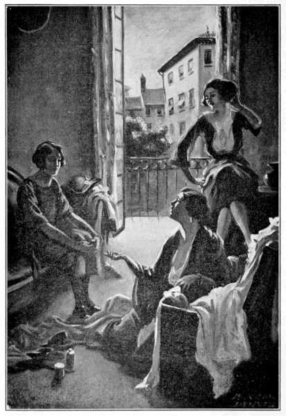 “This way, dear—” he said then, and I went with him up a twisting stairs that had a wrought-iron balustrade, over which was growing a vine[Pg 257] that had its feet in a brick colored jardiniere. . . . It was a very, very pretty house, and more than that. It was built for comfort too. There were soft, deep low chairs all around, and ash trays on tiny tables, and magazines, and books—hundreds of books in every room—I kept thinking of how Miss Sheila would like it.