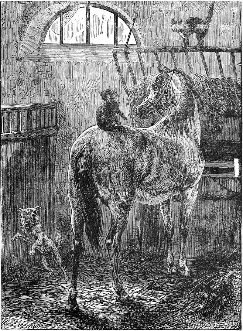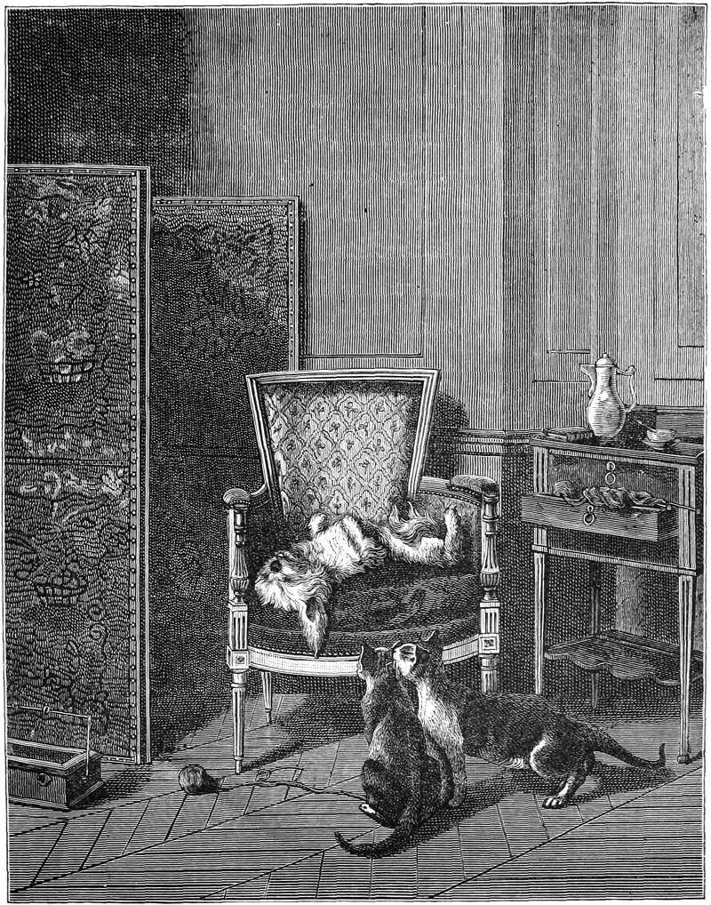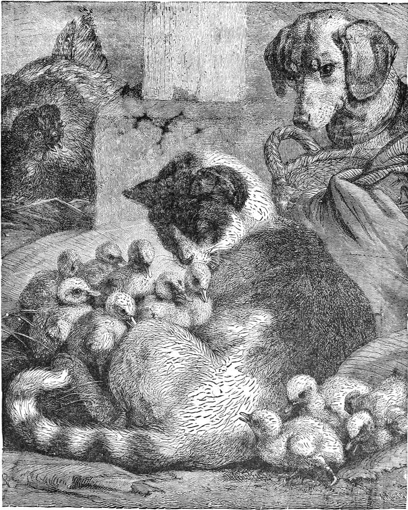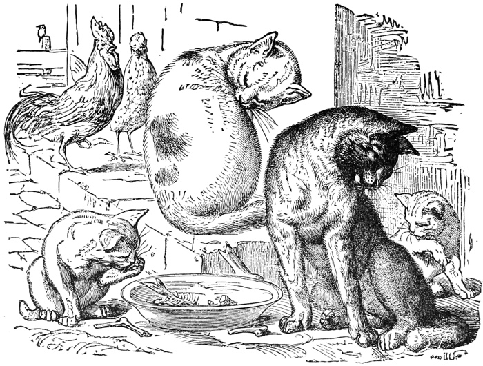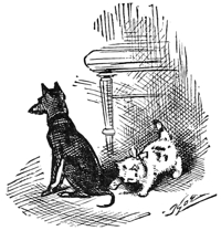 “After the King of the Cats died, and the King of the Cats’ son had been made king, the rats and mice sent to ask if the cats and the rats and mice could not be friends, so that there might be peace between them. The new king said he did not think it would be a good plan at all, but he would see what the dogs had to say about it, for dogs had the name of knowing more than cats. He picked out three of his wisest cats, and sent them to the dogs, and the dogs picked out two of their chief dogs, one named Know and the other named Quick, and the two dogs and the three cats met together. Quick asked Know what cats could live upon if they did not eat rats, and mice. Know said that if cats should give up catching, then people would feed them more. People kept from feeding them so as to make them catch.