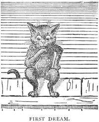 “My next unhappiness was the unhappiness of being whipped with a rod. An old lady wished for a cat to catch her mice and thought she would take a kitten and teach it to behave well. I was carried to her home. I had here a warm place, and a carpet, and the old lady did not stroke at all, so that I was not made unhappy by bad stroking. But my unhappiness was great, on account of the rod. It was rod here and rod there; rod on the pantry shelf and rod on the chair-cushion; rod on the parlor sofa and rod on the best bed; rod at the milk pitcher, and rod at the custard pie.