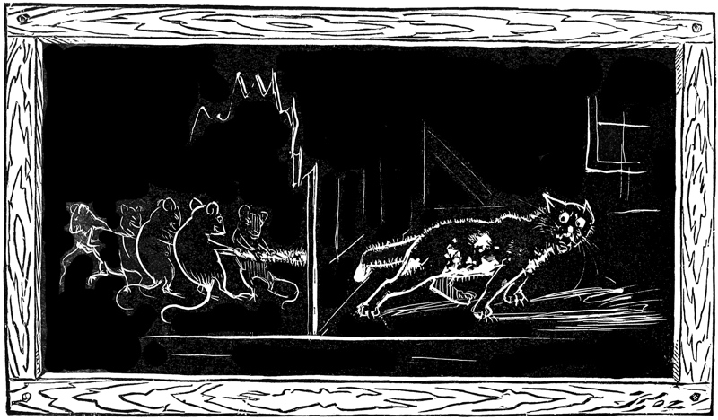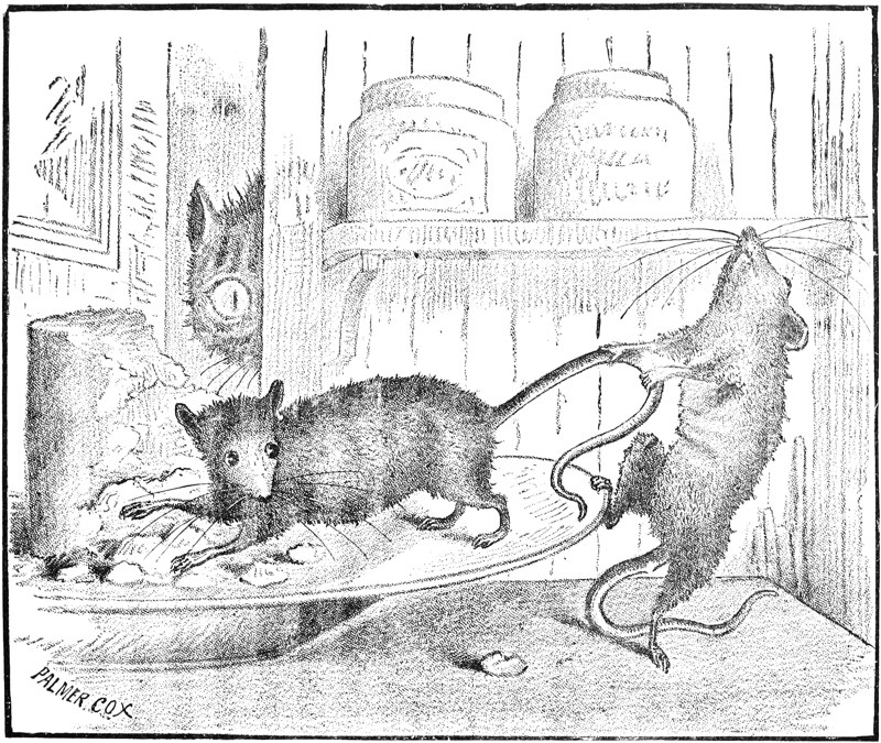 “She was so afraid the cat did not know of the peace and would eat the young rat that she caught hold of his tail quick and pulled him with all her might and they ran out of the Ice-cream Place by two rat-holes. The mother rat and the frog were waiting for the young rat and he travelled on with them.