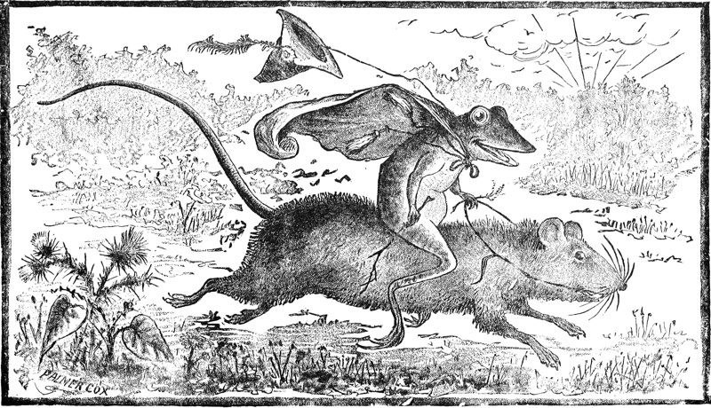 “The young rat was in a hurry to get away from the cats, and the frog was in a hurry to get away from the hens and other fowl. The young rat said that as he could go faster by runs than the frog could by leaps, he would take the frog ratback. The frog threw on a hat and cloak to hide himself, as he had to sit high, in plain sight, and got on the young rat’s back, and they went so swift that the frog lost his hat off behind.