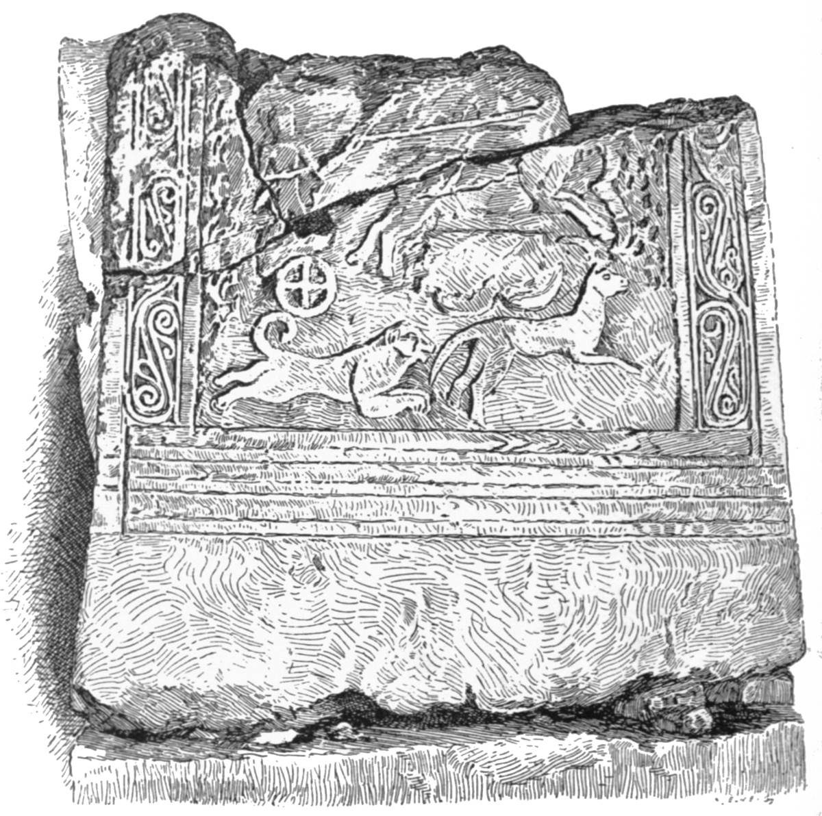[324] It must be observed that although we are obliged in the engraving to bisect this relief, it is really continuous. The head of the lion in the upper line fits on to the body of the lion in the lower line.