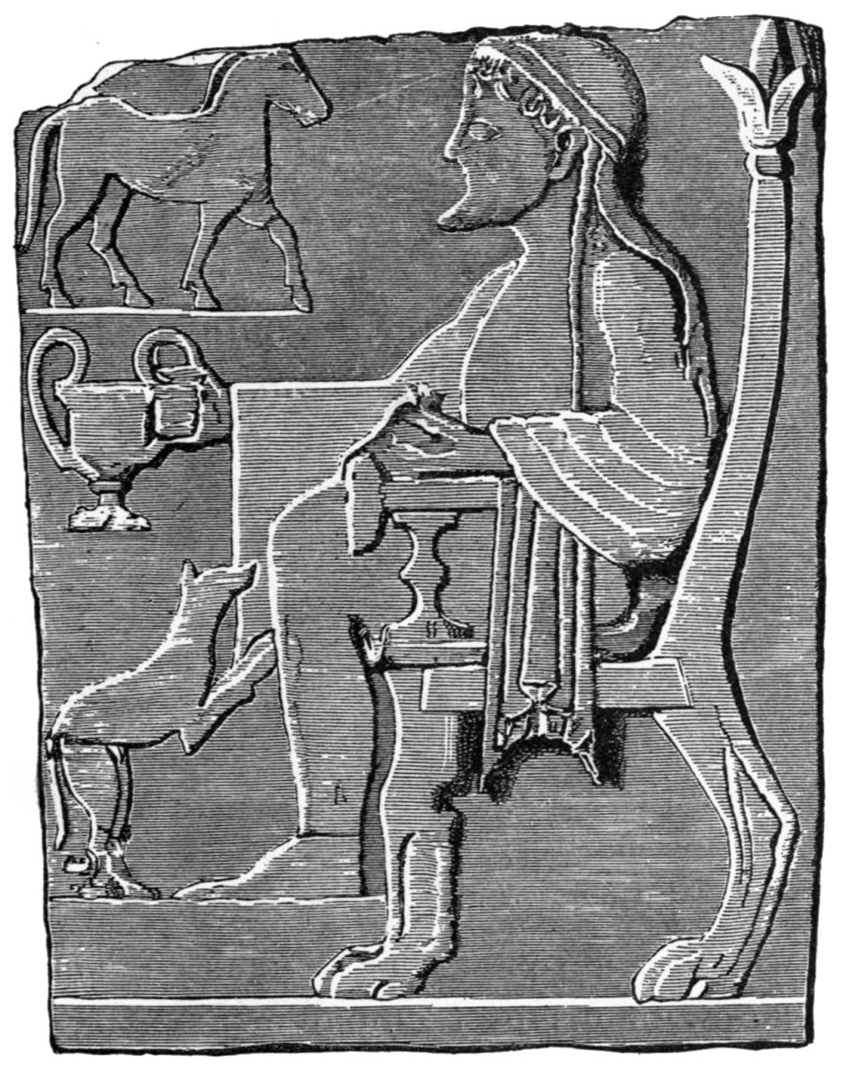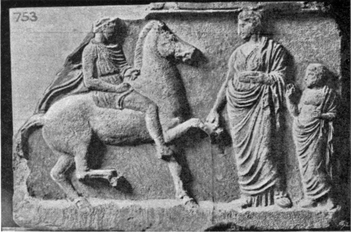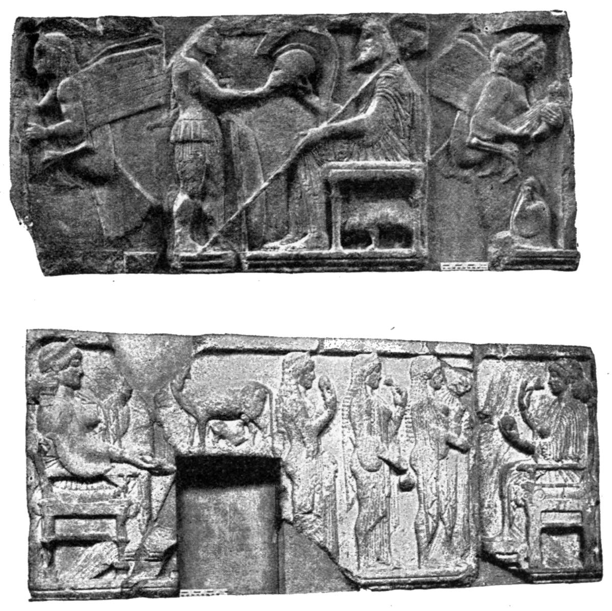 | Distinction of tombs from commemorative tablets, 87. Lines of descent from Spartan reliefs, 88. Athenian banqueting reliefs, 88. Customs of sitting and reclining, 89. Tegean relief, 90. Presence of votaries, 91. Asklepian tablets, 92. Tablets to heroes and to ancestors, 93. The hero as horseman, 94; accompanied by lady, 98. Votive tablets from Tarentum, 100. The hero as foot-soldier, 102; unarmed, 103. |