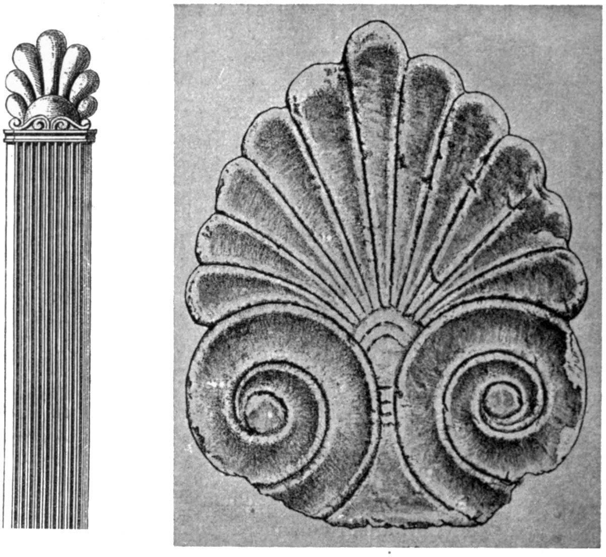 | Graves of Dipylon style at Athens, 105. Periods of Athenian monuments, 106. First period, the mound and stele, 108; the table, 109; the pillar, 110. Early Athenian tombs usually of the young, 111. Second period; forms of tombs, 112; marble vases, 113. Tombs usually of {xiii}families, 116. The use of painting and metal on marble, 116. Determination of dates of tombs, 117. Third period, 118. Preservation of part of cemetery at Athens, 118. Architectural decoration of tombs; the acanthus, 119; the sphinx, 121; the siren, 126; goats butting, 128; the lion, 130; the bull, 131. |