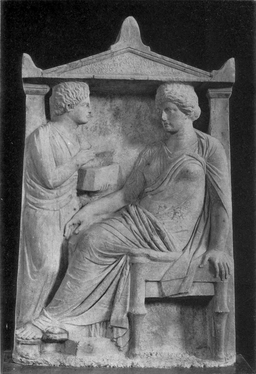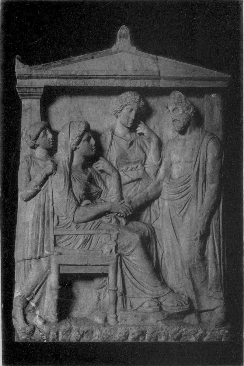 | Pathos and charm of Attic groups, 162. Predominance of women, 163. Women and children in later Greece, 163. Stelae with father and children, 164; mother and children, 166. Family groups, 167. Series of groups representing leave-taking, 168; series representing self-adornment, 171. Stele of Phaenarete, 173. Stele of Ameinocleia, 176. Dressing for a journey or offerings to the dead? 176. Domestic interiors or scenes at the tomb? 178. Several stone lekythi on one slab, 178. Occasional appearance of Hermes, 180. |