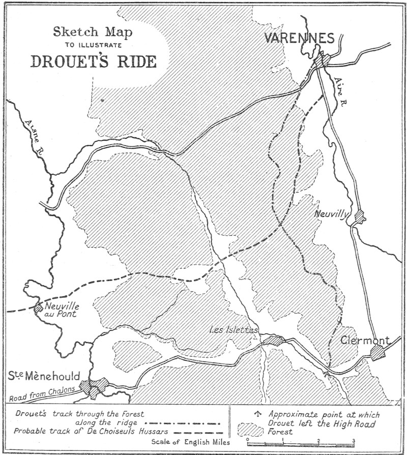 THE reader or student acquainted with various records of the French Revolution may be tempted to regard the account of Drouet’s Ride in my text as containing too much detail for accurate history; especially as no historian has hitherto done more than vaguely allude to it. I will therefore in this Appendix show the way in which I found it possible to reproduce every circumstance of Drouet’s movements from the time when he left Ste. Menehould until the time of his arrival at Varennes.