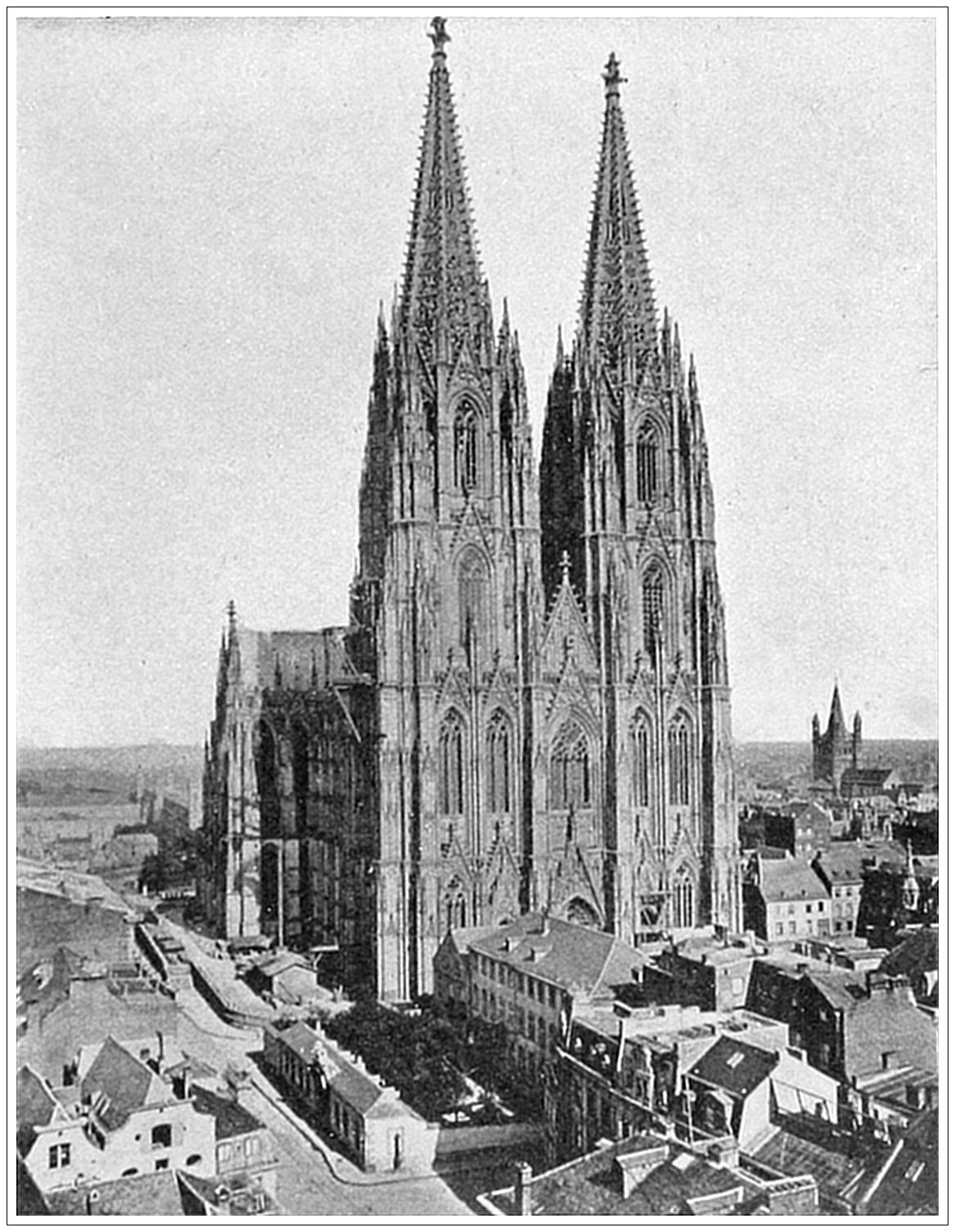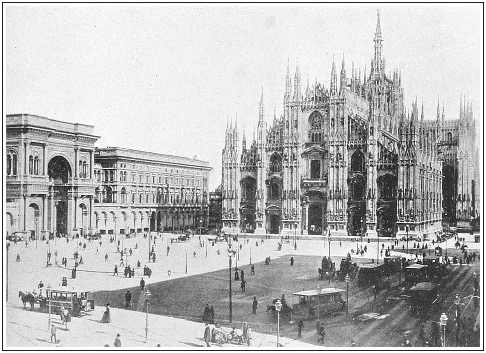 CATHEDRAL, MILAN, ITALY. The Milanese look upon this church as the eighth wonder of the world. In truth, it is a marvelous edifice. “Gothic art,” as Taine says, “here attains its triumph and its extravagance.” Nowhere else is it so pointed, so complex, so highly embroidered, so full of delicate detail. It differs from most Gothic cathedrals in being built, not of dark stone, but of beautiful, lustrous white Italian marble. Begun in 1386, it was not fully completed until 1805, at the direction of Napoleon. The design is said to be taken from Monte Rosa, one of the loftiest peaks of the Alps. Its ninety-eight sculptured pinnacles, rising from every part of the body of the church, certainly bear a striking resemblance to the splintered ice crags of Savoy. Next to St. Peter’s, at Rome, and the Cathedral at Seville, this is the largest church in Europe, covering, as it does, an area of fourteen thousand square yards.