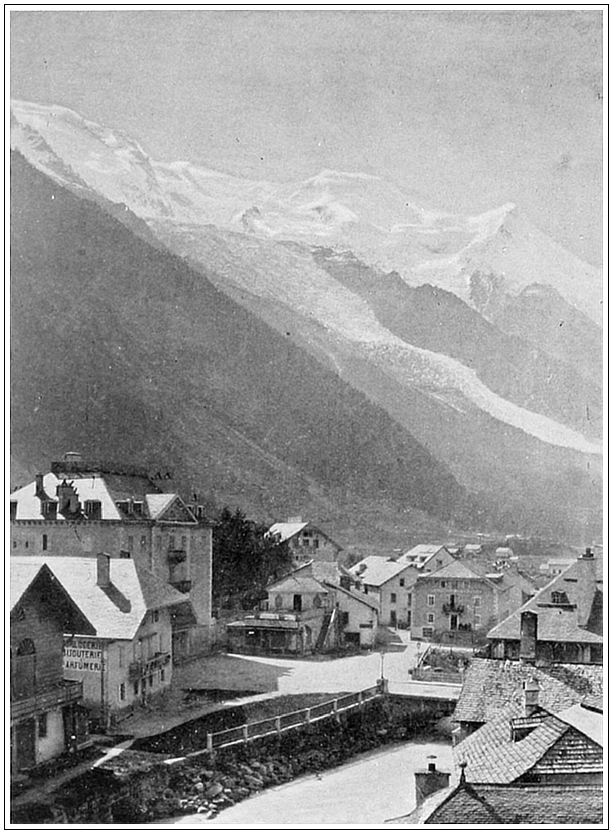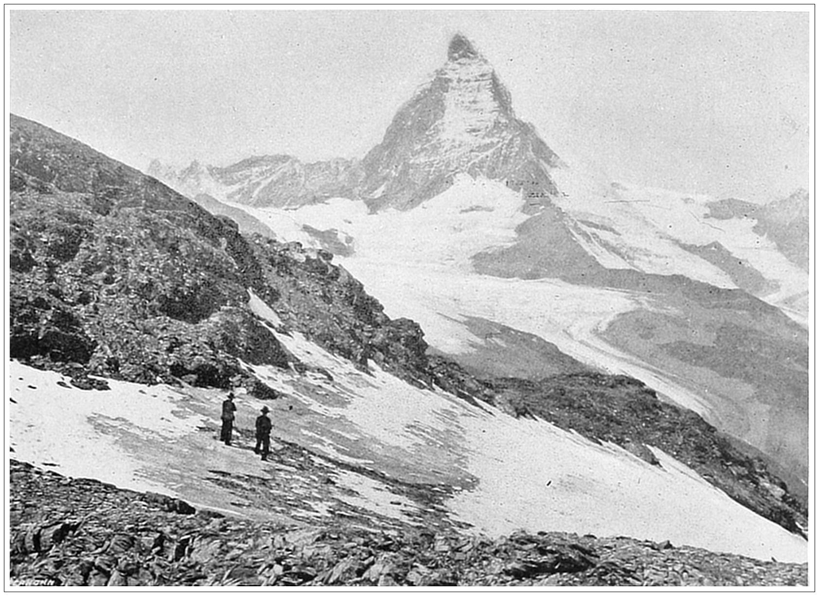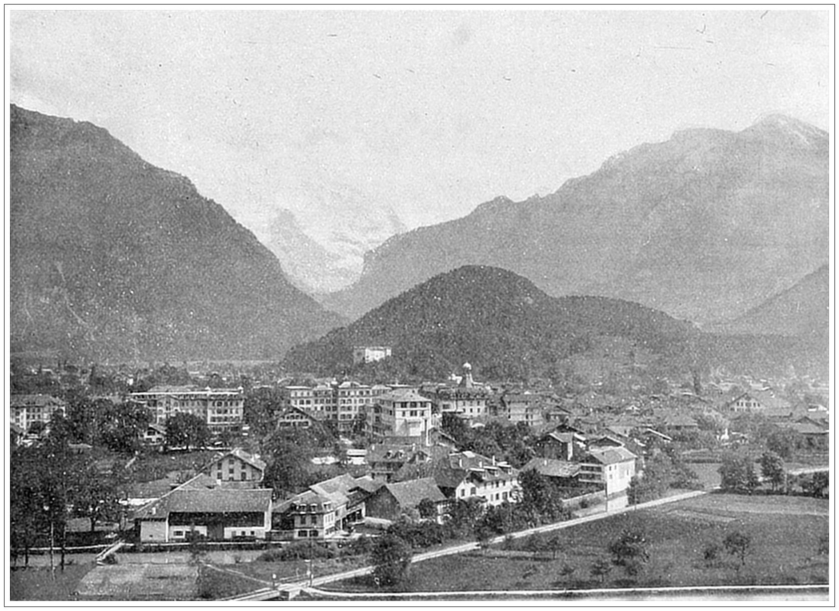 JUNGFRAU FROM INTERLAKEN, SWITZERLAND. The town of Interlaken, as its name indicates, is situated between two lakes (Brienz and Thun), in a valley about three miles wide, on either side of which rises a ridge of precipitous mountains six thousand feet high. The great attraction of the place is not the scenery either way along the valley, but a view that is caught through a depression in the mountains on the southern side, revealing the Jungfrau (“Young Maiden”) Mountain and her attendant galaxy of noble Alpine peaks, rearing their snow-crowned heads far above the horizon. The Jungfrau is the most imposing eminence in all the Bernese Alps. Surrounded by stupendous precipices, her surface is broken by valleys, ravines and glaciers, which from a distance look like creases in the mantle of snow that covers her enormous flanks. The first ascent of this mountain was made on August 3d, 1811.