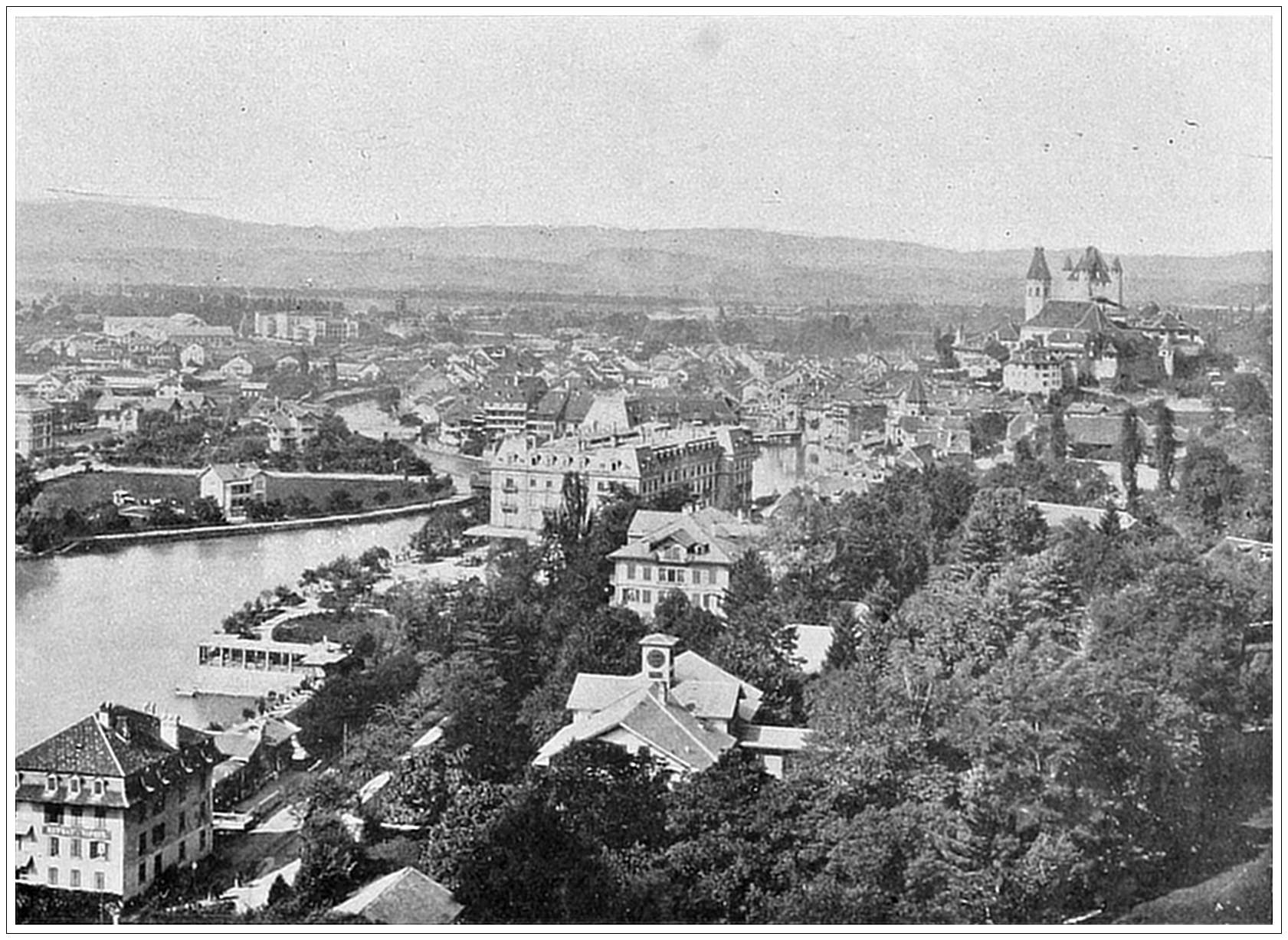 THUN, SWITZERLAND. One of the most picturesque of Swiss towns is Thun, which is charmingly situated on the banks of the river Aar, three-quarters of a mile below its efflux from the lake. Many of the town’s buildings are very old. The Castle of Zahringen-Kyburg, whose large square tower forms a noted feature of the landscape, dates from 1182. The principal street is curious. In front of the houses projects a row of warehouses and cellars, on the flat roofs of which is the pavement for foot passengers, flanked with the shops. The view here presented is taken from the pavilion in the Bellevue Grounds, which overlooks the city, and commands the old-fashioned town, the lake, the Alps and the Valley of the Aar.
