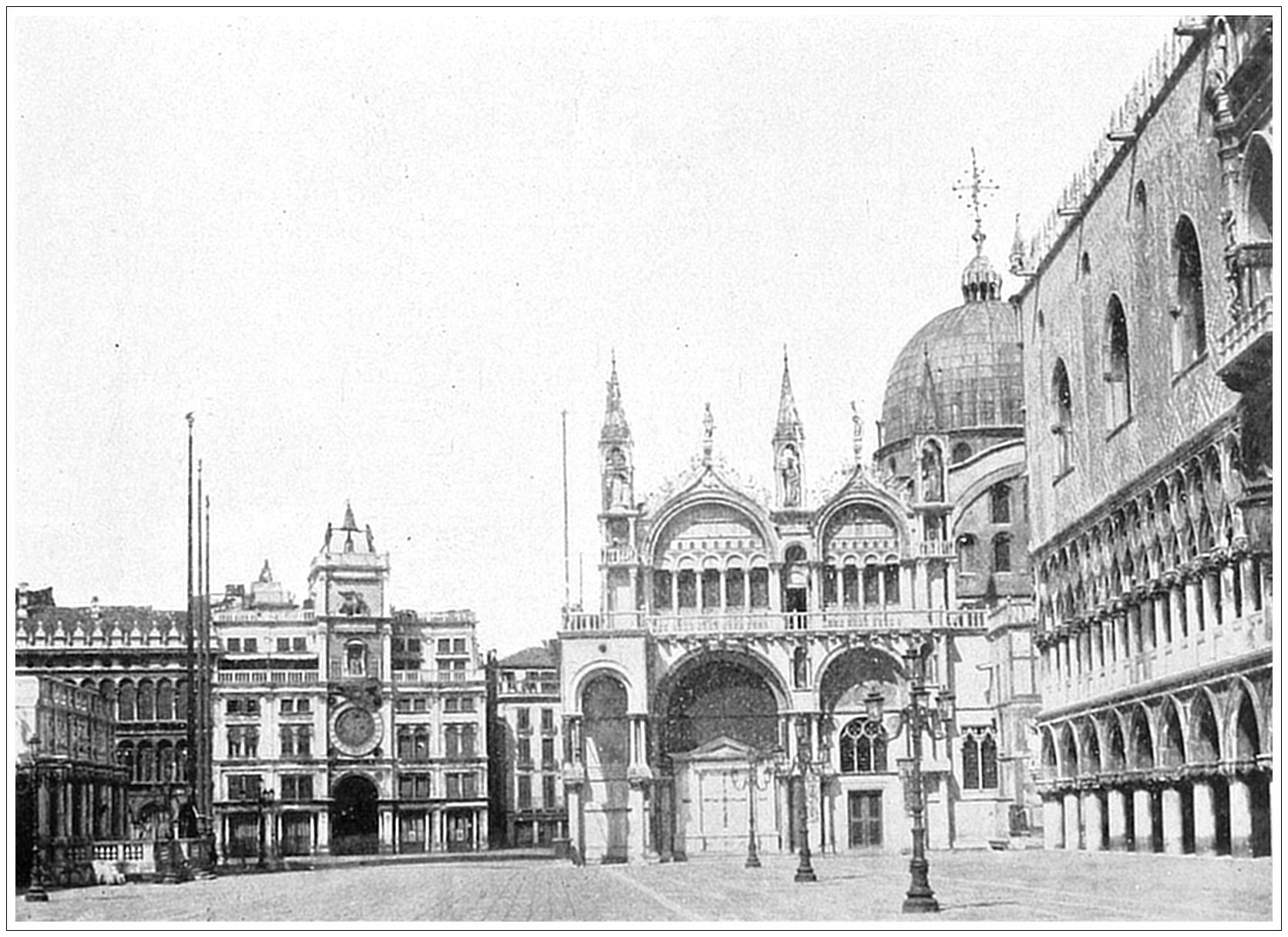 ST. MARK’S, VENICE, ITALY. This famous cathedral church is a strange jumble of all styles of architecture, Christian as well as Saracenic, yet both without and within breathing a rich and wonderful harmony. The present building, dedicated in 1085, takes the place of an older and simpler structure, that was destroyed by fire in 976. In front of the church, to the southwest, rises the Square Campanile, surmounted with the figure of an angel. To the east of the church the famous Piazzetta, or “Little Square,” extends to the Grand Canal, glorified by the Palace of the Doges, or ancient rulers of the city, which some architects look upon as the finest building in the world. It is from this Piazzetta that the picture is taken. The square in front of St. Mark’s is the grand focus of attraction in Venice, and in summer nearly the entire population congregate here.