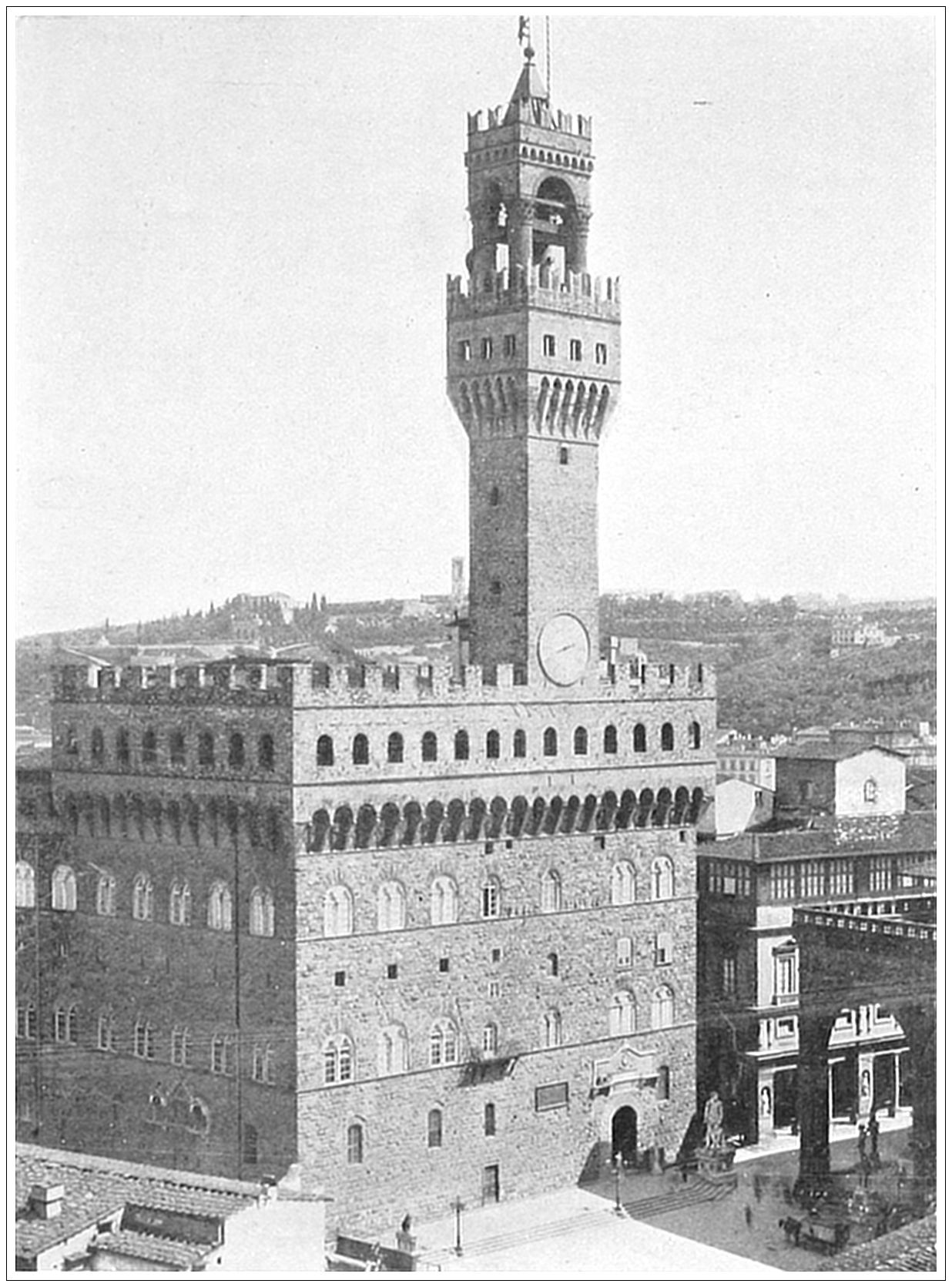 PALAZZO VECCHIO, FLORENCE, ITALY. The ancient capitol of the Republic of Florence, and subsequently the residence of Cosmo de’ Medici, is known as the Palazzo Vecchio, or Old Palace. Begun in 1298, it is a striking example of the Florentine castles of the Middle Ages, with its enormous projecting battlements and its disproportionate bell tower, defiantly stuck upon the walls without regard to symmetry, and almost overhanging the battlements. It is situated in the Piazza della Signoria, the historic, as well as the commercial, centre of Florence. The court is adorned with a fountain and sculptured columns. In front of the entrance is Bandinelli’s group of Hercules and Cacus. At right angles to the left is the Loggia dei Lanzi, an open arcade, famous for its own beauty and for the sculptured master-pieces which it enshrines. A large and elegant fountain is on the right.