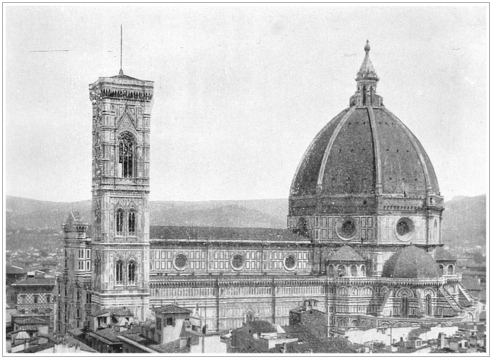 CATHEDRAL OF FLORENCE, ITALY. This is generally known as the Duomo or Dome, though its official designation is Santa Maria del Fiore. Arnolfo di Cambio began it in 1298; he was succeeded by Giotto, and the dome was added by Brunelleschi. The latter is not only beautiful in itself, but is interesting as the first of the great domes of the modern world. A half-finished façade was destroyed by fire, and the deficiency was not supplied until 1875–1884. The interior is impressive, though almost entirely devoid of ornamentation. Outside the church, to the left, is the Campanile, an exquisite work by Giotto; so exquisite that Charles V declared it ought to be kept in a glass case. In front is the Baptistery, an octagonal building, surmounted by a dome. It was begun in 1352 and finished in 1358. Its chief attraction lies in the bronze doors, especially those by Lorenzo Ghiberti, which Michael Angelo eulogized as worthy to be the gates of Paradise.