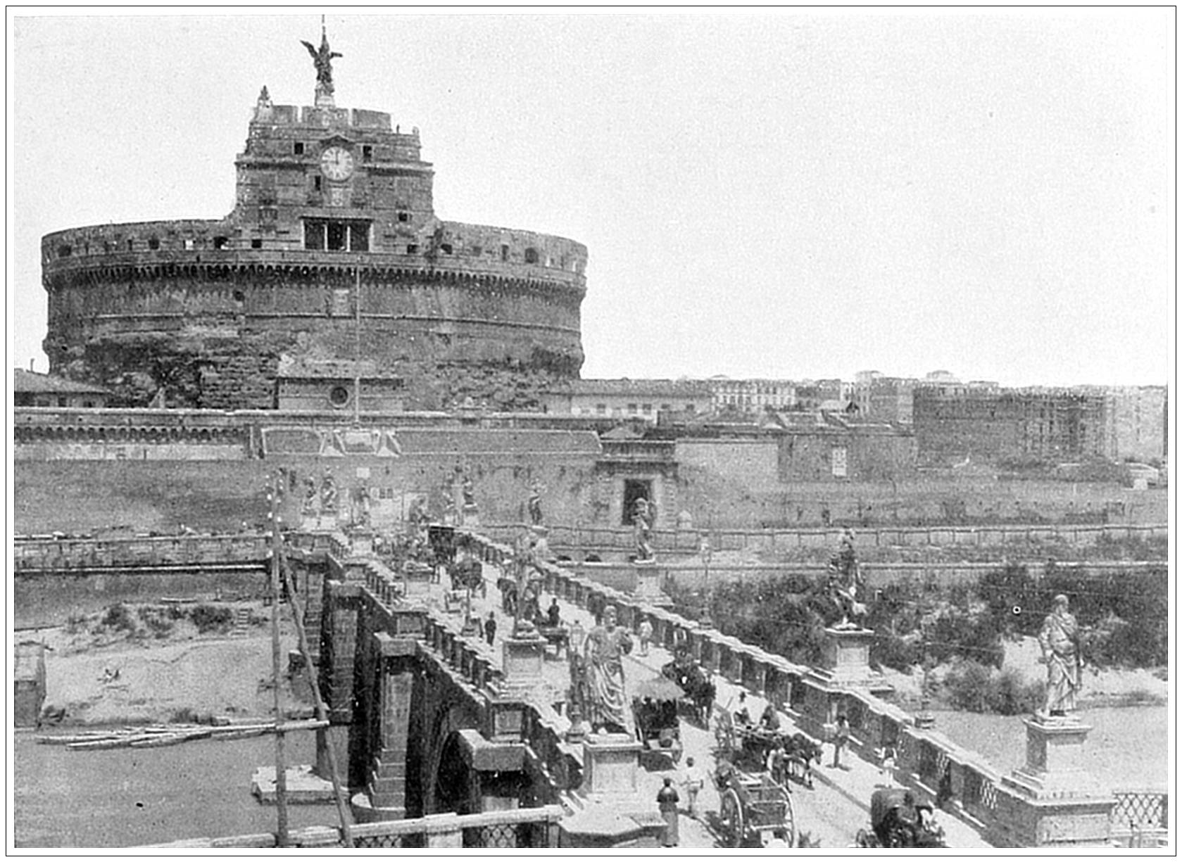CASTLE OF ST. ANGELO, ROME. Originally this famous structure was built by the Emperor Hadrian as a mausoleum for himself and his family. The same emperor also erected the bridge now known as St. Angelo—anciently as the Pons Ælius—which crosses the Tiber opposite the castle. Tradition affirms that Gregory the Great in 589 changed the name in memory of a vision of the Archangel Michael, who appeared to him standing on the summit of the mausoleum. He built a chapel on the summit, but subsequently this was replaced by the statue still extant. During the Middle Ages this was the fortress of Papal Rome, and its history at that period is bound up in the history of the city itself. It has also served as a prison, and part of it was up to recent times still used for that purpose. It has suffered much from sieges and the ravages of time, and is now but the skeleton of the magnificent pile erected by Hadrian. No vestige remains of the shell of Parian marble which encircled it, while the statues were torn off to be used as missiles against the Goths, and later as cannon balls.