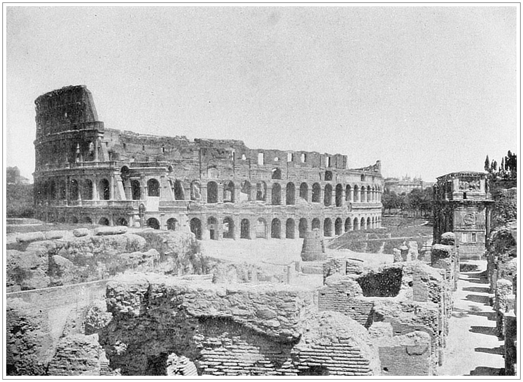 THE COLOSSEUM, ROME. This mammoth ruin, originally known as the Flavian amphitheatre, is the most magnificent relic of ancient Rome. Begun by Vespasian in A. D. 72, it was dedicated by Titus in A. D. 80 and was subsequently added to by Domitian. As the circus of the public games for nearly four hundred years, it was the scene of gladiatorial conflicts and of the persecution of the Christian martyrs. After the triumph of Christianity it fell into neglect, and suffered continuous spoliation as a quarry for the material of new buildings. Finally, in 1750, Benedict XIV rescued it in its present condition by dedicating it to the memory of the Christian martyrs who had suffered therein. A cross in the middle of the amphitheatre is continually visited by the pious. “As it now stands,” says Forsyth, “the Colosseum is a striking image of Rome itself, decayed, vacant, serious, yet grand, half gray and half green, exact on one side and fallen on another, with consecrated ground in its bosom.” Hillard calls it “a great tragedy in stone.” It was originally built to seat ten thousand spectators. There were three orders of architecture used in the four stories; the first, Doric; second, Ionic; third and fourth, Corinthian. In each of the lower tiers there were eighty arches. The height of the outer wall was one hundred and fifty-seven feet, the circumference one thousand six hundred and forty-one feet, the entire superficial area being six acres.