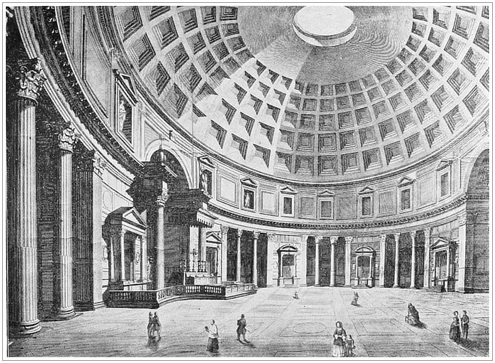 THE PANTHEON, ROME. This is one of the grandest, as it is the most perfectly preserved, of all the ancient monuments of Rome. Except for the ridiculous belfries superimposed by Bernini on the outside, it is to-day substantially in the same condition as when Marcus Agrippa in B. C. 27, after the establishment of universal peace, consecrated it to all the gods. In A. D. 608 it was dedicated as a Christian church by Pope Boniface IV, under the name of Santa Maria ad Martyres. The portico is of faultless beauty, and the interior, as the picture shows, is a perfect rotunda, impressive in its grand simplicity. The domed ceiling is lighted solely by an aperture twenty-three feet in diameter, the wall being supported by a huge bronze ring. An additional interest for moderns lies in the tombs of Raphael, Caracci and other painters who are buried therein, and more recently the remains of Victor Emmanuel have been added to those of the artistic brotherhood.
