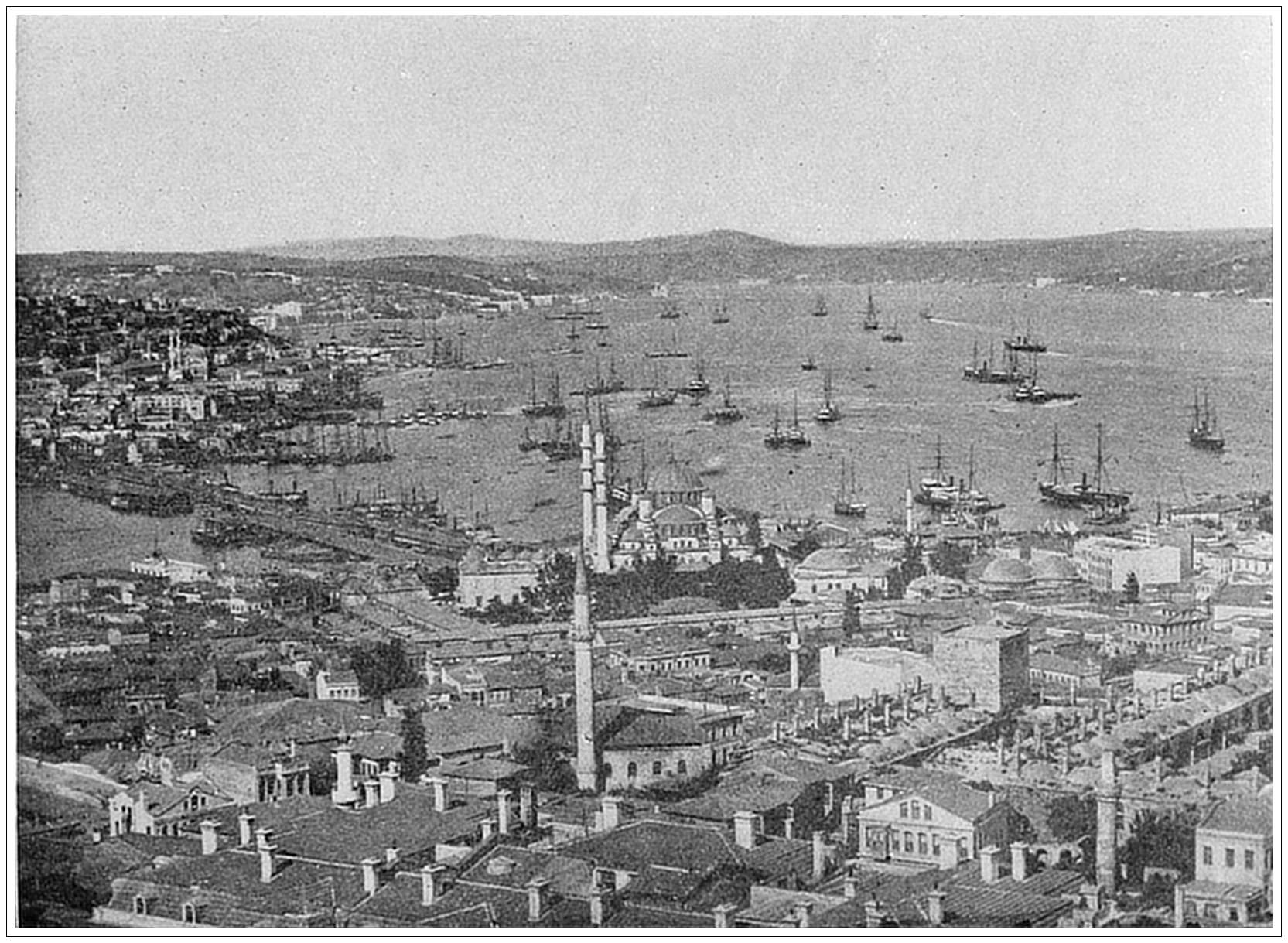 THE BOSPHORUS, FROM CONSTANTINOPLE, TURKEY. No city in the world occupies a more magnificent natural position than the capital of Turkey. It is made up of three cities, each distinct and different from the others. Stamboul, the old city, lies upon a tongue of land of triangular shape, having the sea of Marmora on the south, the Bosphorus on its eastern apex and the Golden Horn on the north. Its seven hills are crowned with domes and minarets and fantastic houses, backed by the dark foliage of the cypress and other trees in the cemeteries beyond the walls. To the north is the European quarter, Galata being the business centre, while Pera is studded all over with the splendid residences of the foreign ambassadors, &c., and lined along its shores with the palaces and gardens of the Sultan and the adjoining mosques. Skutari, the Asiatic quarter of Constantinople, is on the eastern side of the Bosphorus. Nowhere else is there a picture so bright, so varied in outline, so gorgeous in color, so heterogeneous in its component parts.