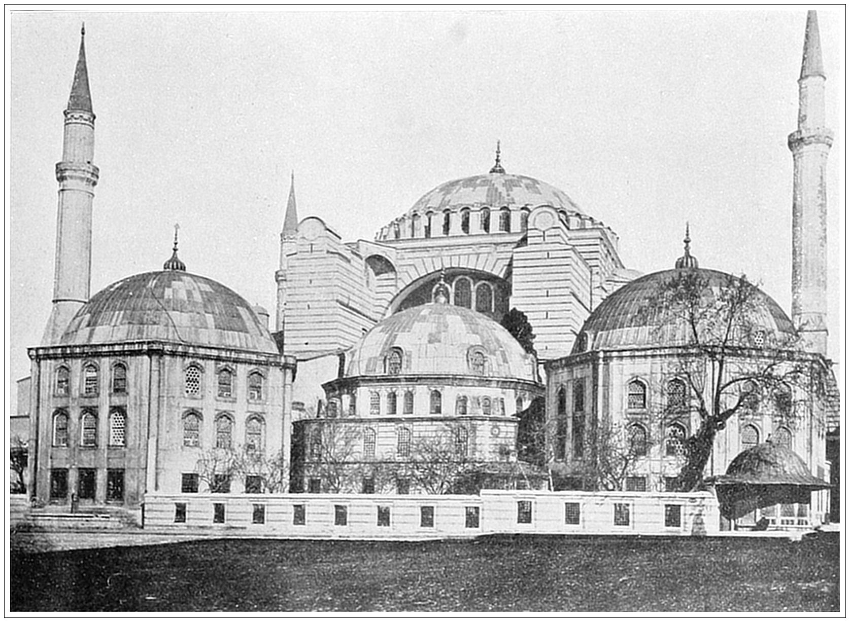 THE MOSQUE OF ST. SOPHIA, CONSTANTINOPLE, TURKEY. This is the principal place of Mahommedan worship in the world. Anciently a Christian temple, built in 532 by Justinian, it was converted into a Moslem mosque in 1453 by Mohammed II, the conqueror of Constantinople. The building is in the form of a Greek cross, two hundred and seventy feet long by two hundred and forty-three wide, surmounted by a flattened dome one hundred and eighty feet high, with several smaller domes and minarets. The style of architecture is Byzantine. The exterior is not as imposing as the interior, which even now is rivaled by few Christian churches, and at the time of its erection made this masterpiece of Byzantine architecture the greatest temple in the world. Well may Justinian have exclaimed: “I have surpassed thee, O Solomon!” The changes made by the Moslems are greater inside than out. In the interior the mosaics have been partially covered up and replaced by inscriptions from the Koran, but there is no structural change. Outside most of the older annexes have been swept away and replaced by Turkish buildings, lofty minarets rise at each corner, and the crescent replaces the cross on the dome.