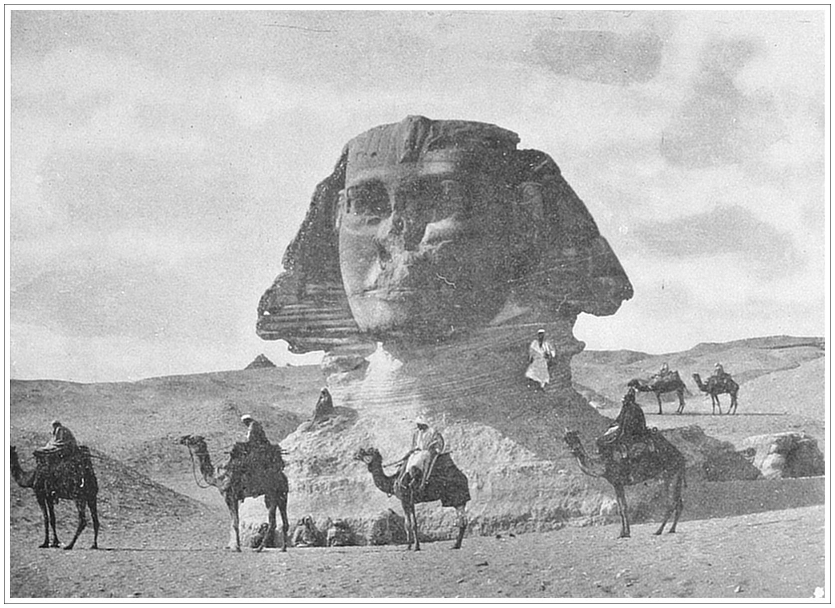 THE SPHINX, EGYPT. This unique monument, situated near Cairo, in the neighborhood of the Pyramids, is one of the most characteristic and probably the oldest of Egyptian remains. As such it is the oldest monument in the world. Recent researches show that it is more ancient than even the Pyramid of Cheops. Originally it was a recumbent figure, representing an andro-sphinx, or man-headed lion, one hundred and eighty-eight feet nine and one-half inches in length, hewn out of the solid rock. Steps led down to its front, where there was a sanctuary and tablets. But the sands covered all save the head, shoulders and back, which rose from the surrounding desert with a startling and almost fearsome abruptness. In this condition the monument was allowed to remain for centuries. But more recently excavations have been started to restore it to its pristine state, and before long the entire colossal figure will be bared to view.