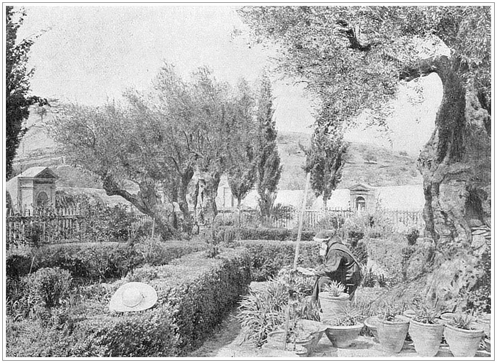 GARDEN OF GETHSEMANE, JERUSALEM. No spot in the whole world could have more interest for the Christian traveler than the Garden of Gethsemane, the scene of our Lord’s agony on the eve of His crucifixion. It is known that it was a garden or orchard belonging to a small estate at the foot of Mount Olivet, somewhere on the east slope of the Kedron Valley and about half a mile from Jerusalem. But whether the present enclosure which is pointed out as the identical garden be so or not is a matter which archæologists have not yet settled. Certainly, the garden is very old and very venerable; its few olive trees date back to an unknown antiquity, and it may very well have been extant in almost its present condition in the time of Christ.